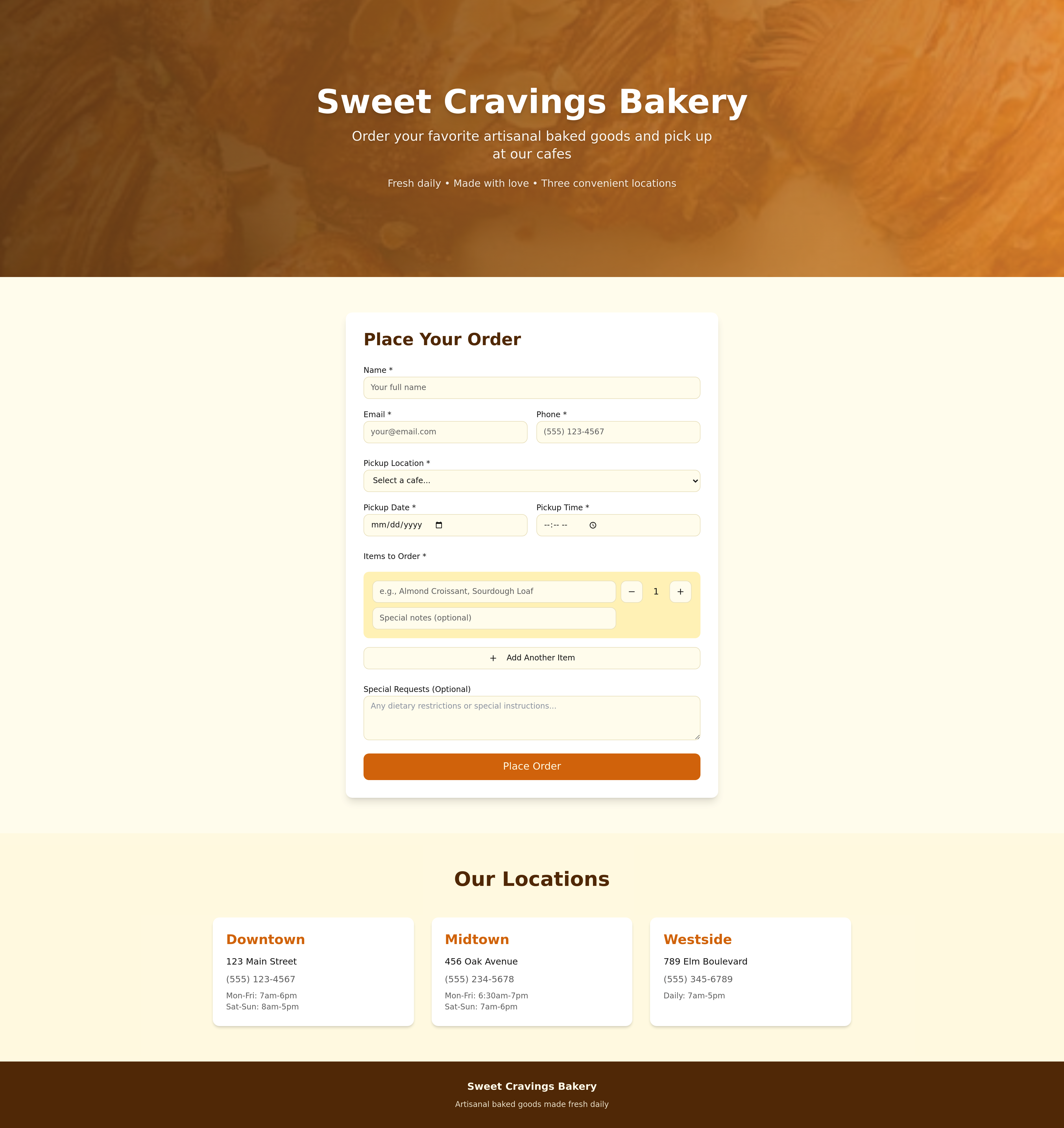 A user-friendly online booking system for bakeries, allowing customers to easily pre-order and pick up their favorite baked goods from designated cafe locations. Streamline your bakery's order process and enhance customer convenience with this efficient web application.