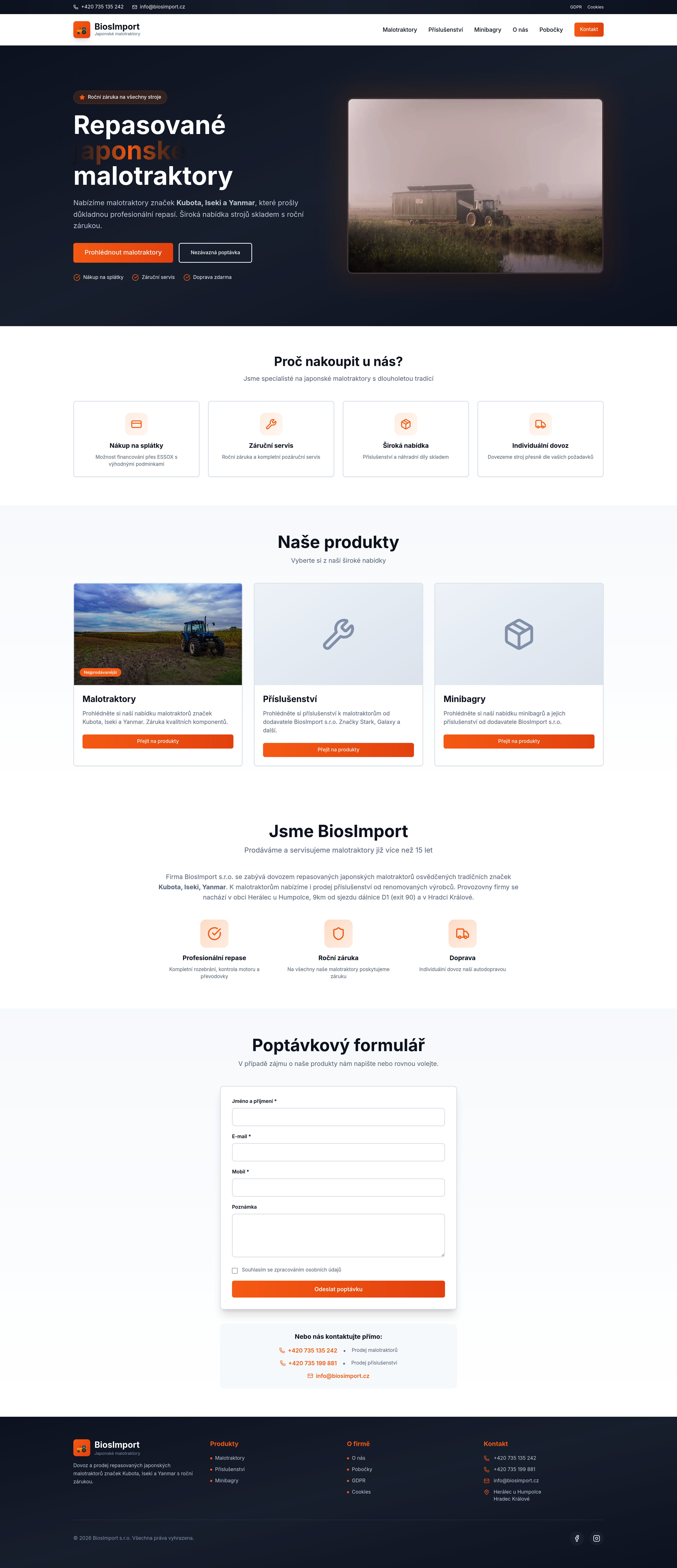 SEO-optimized e-commerce website for BiosImport, specializing in refurbished Japanese mini-tractors (Kubota, Iseki, Yanmar) and accessories (Stark, Galaxy). Features include product catalogs, a blog, and a Snipcart-powered e-shop with inquiry forms for tractors and direct purchase for accessories. Designed for high performance and local SEO with a professional, industrial aesthetic.