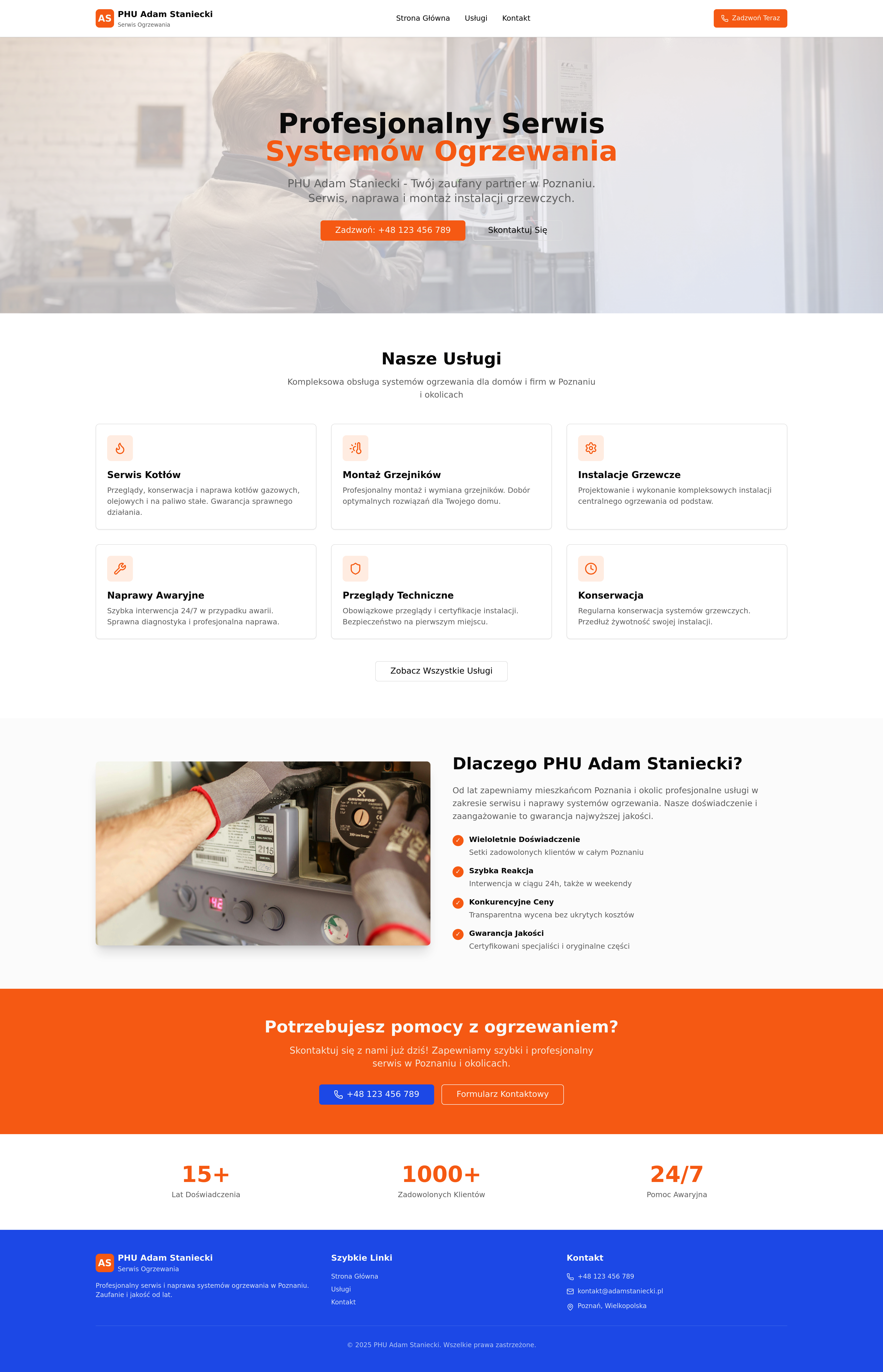 Showcase for PHU Adam Staniecki, a local heating service and repair company based in Poznań, Poland. This business website highlights their expert services, contact information, and service areas for heating system maintenance and repairs.