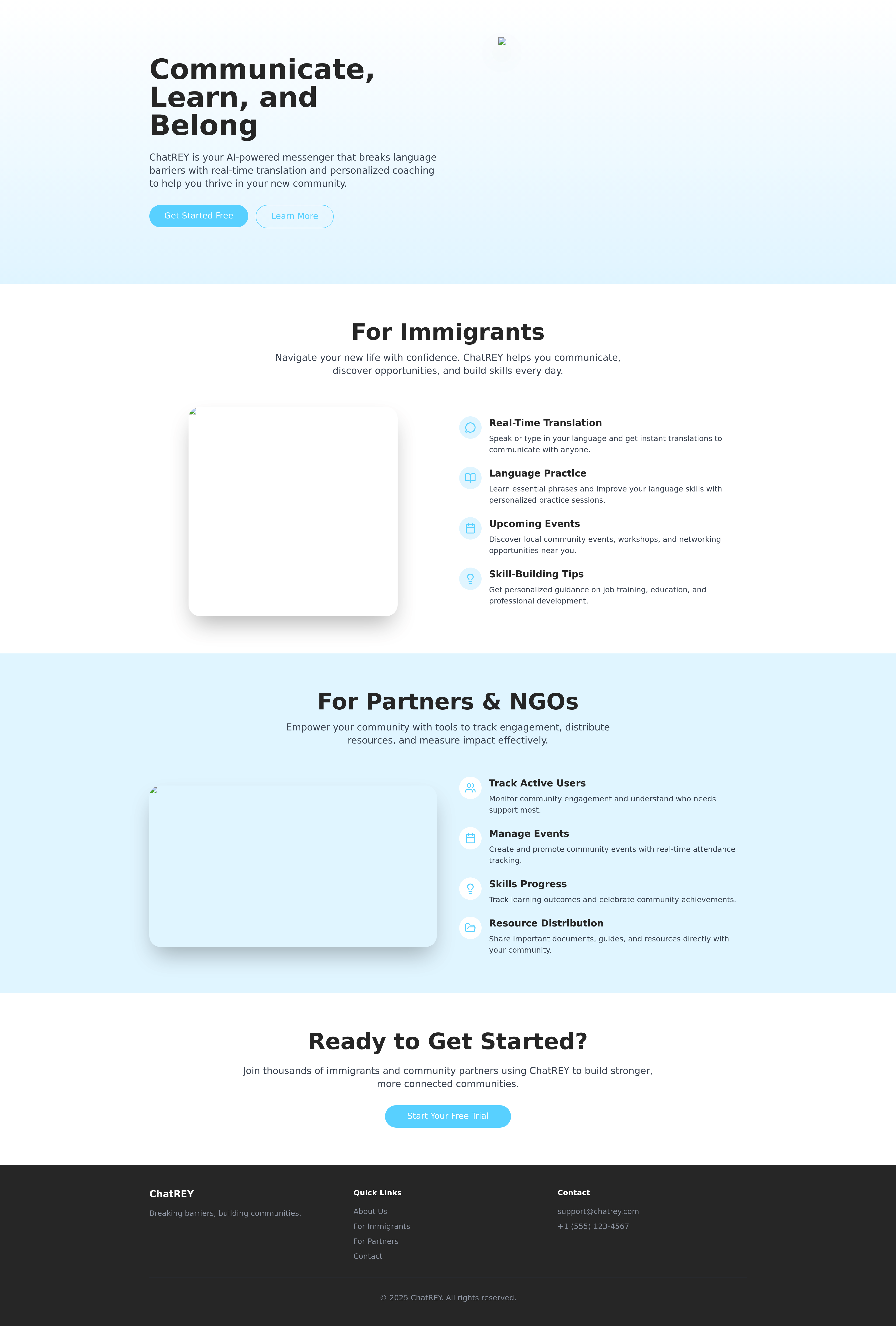 ChatREY.com is a modern AI-powered landing page designed to assist immigrants with real-time language translation and AI coaching. This website showcases features like instant message translation, AI-driven conversational guidance for job searching and skill development, and a comprehensive dashboard for partner organizations to track user engagement and resource distribution. It aims to be a friendly, helpful, and trustworthy platform for immigrants seeking support and resources.
