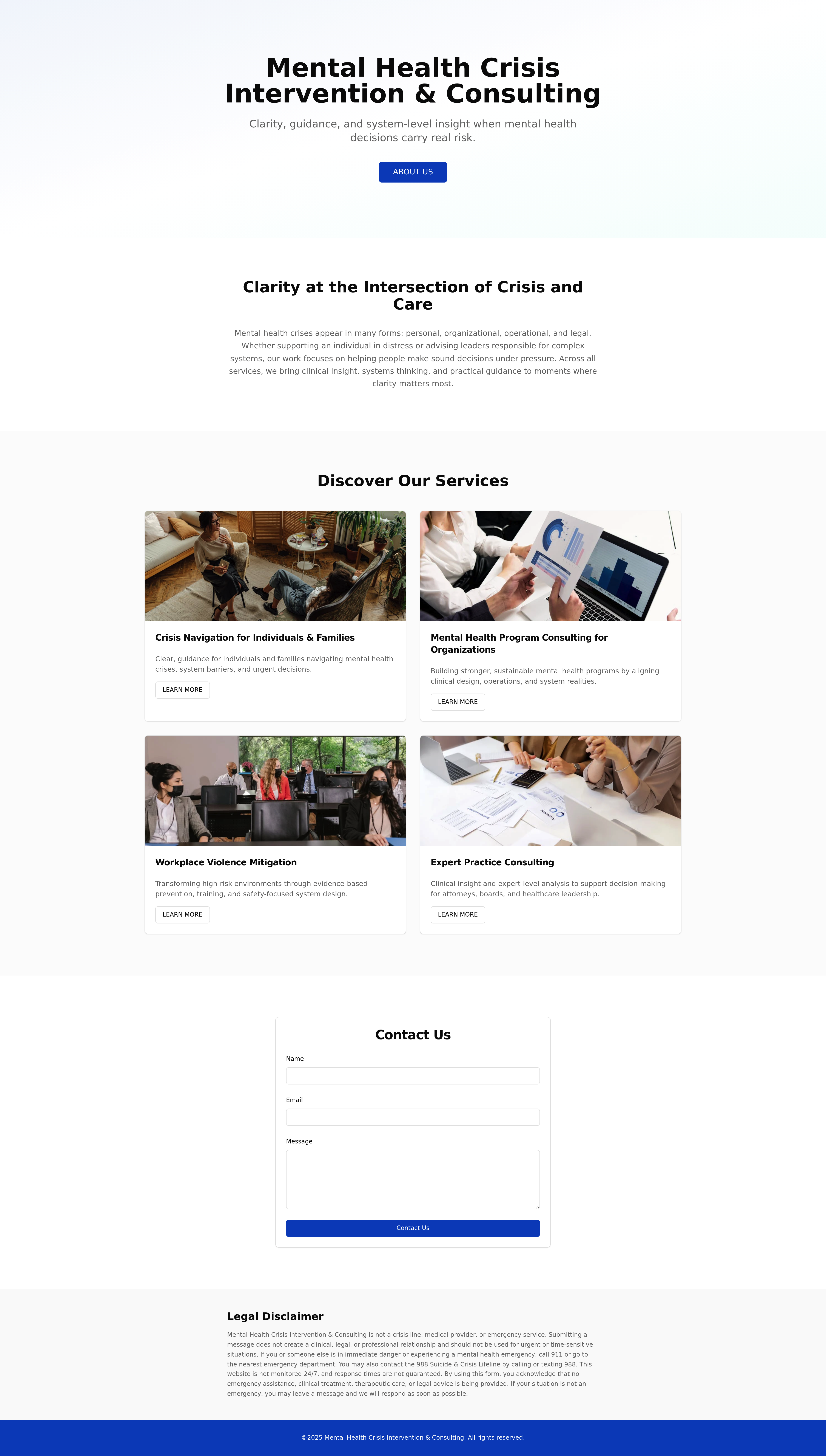 Specialized mental health consulting website offering expert guidance for individuals and organizations facing mental health crises. Provides clinical insights, systems thinking, and practical solutions for decision-making under pressure. Ideal for businesses, leaders, and individuals seeking support in complex mental health situations.