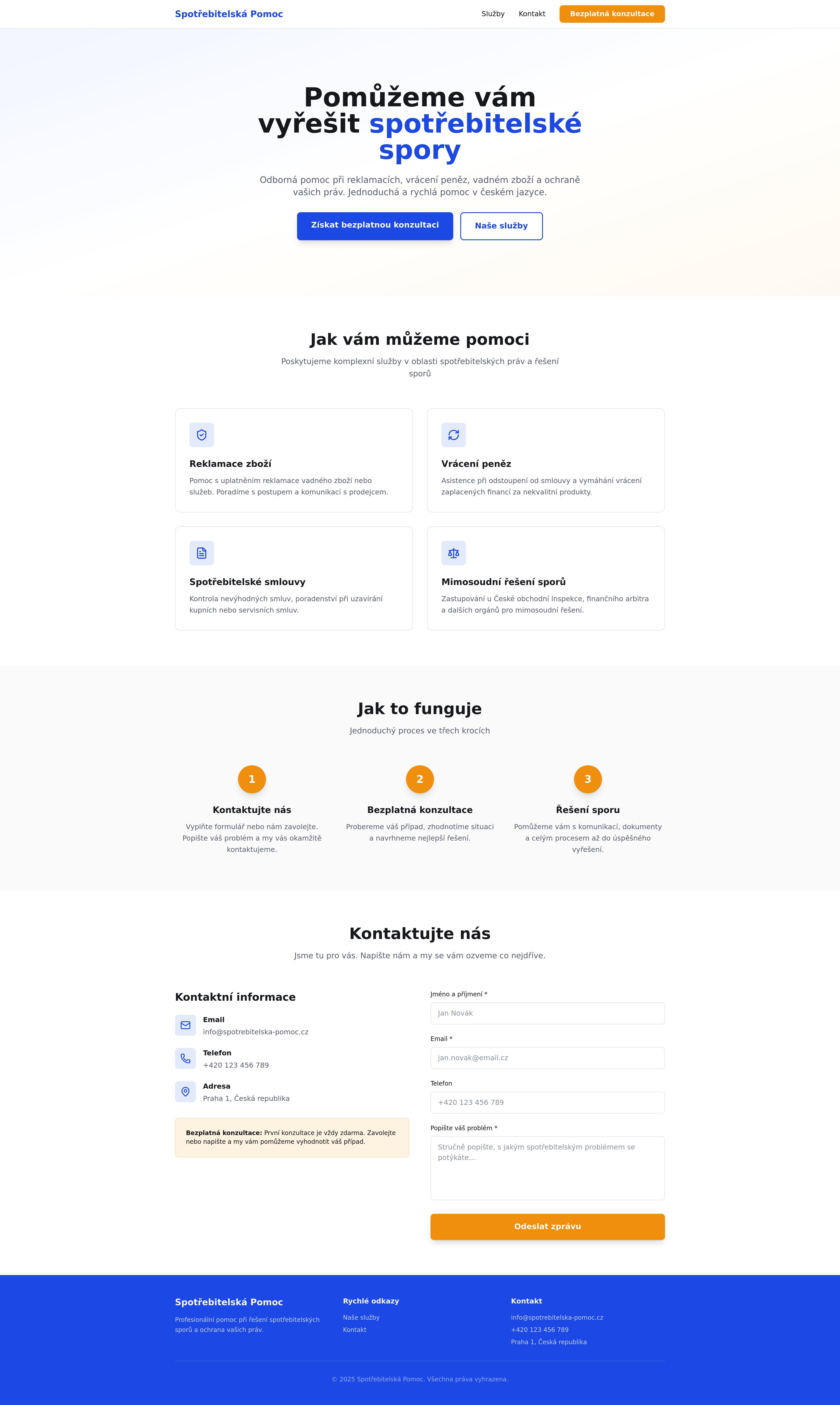 Vytvořte webovou stránku pro pomoc spotřebitelům s řešením spotřebitelských sporů. Poskytuje komplexní informace, poradenství a nástroje pro efektivní řešení konfliktů s prodejci a poskytovateli služeb. Získejte právní rady, vzory dokumentů a průvodce celým procesem reklamace a mediace. Ideální pro spotřebitele hledající rychlou a účinnou pomoc.