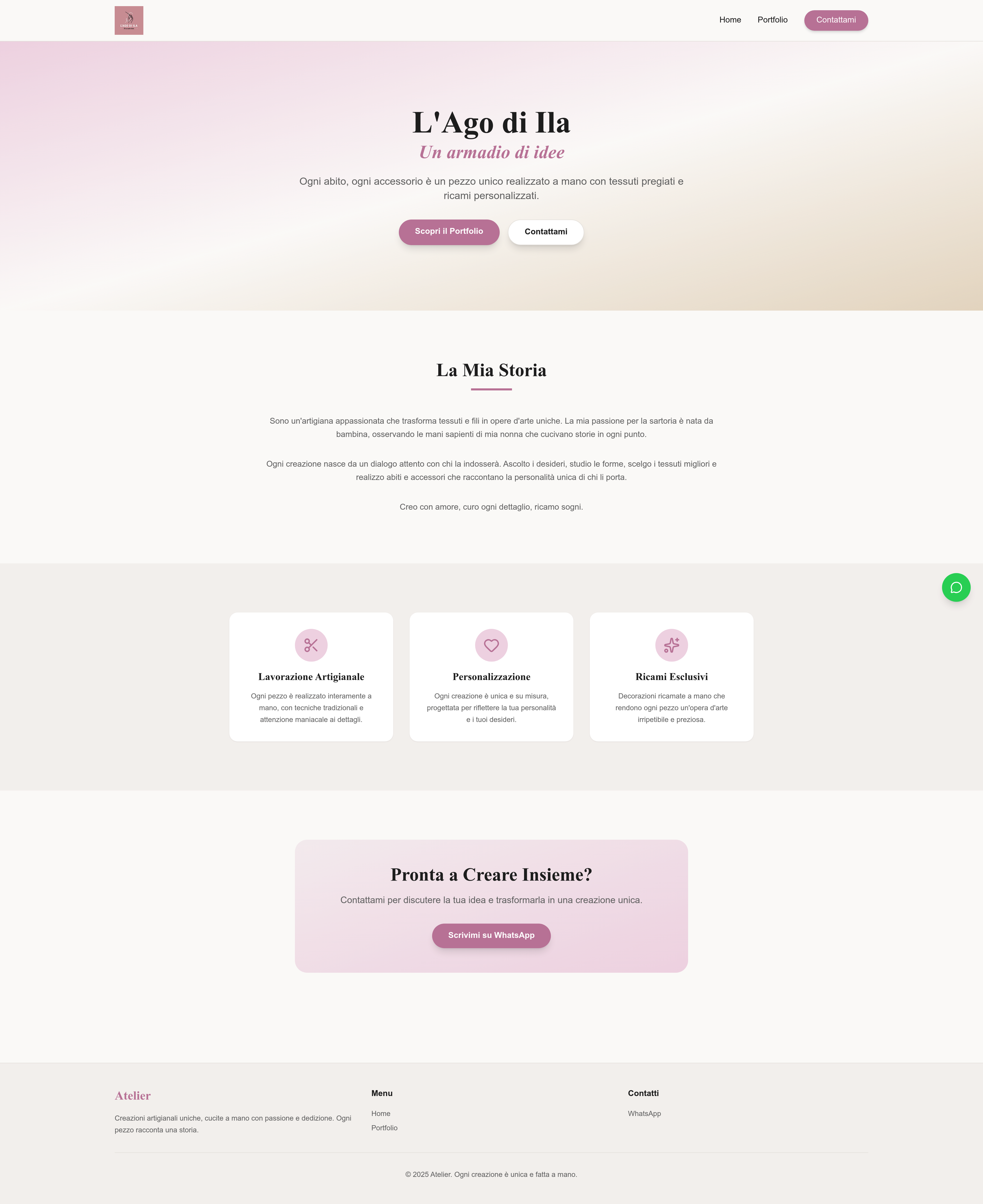Showcase a bespoke collection of handmade apparel and embroidered fabric accessories. This portfolio website features a dedicated section introducing the artisan behind the unique creations and a categorized gallery to display her custom clothing and accessory designs. Each page includes clear calls-to-action and a direct WhatsApp contact button for custom orders and inquiries.