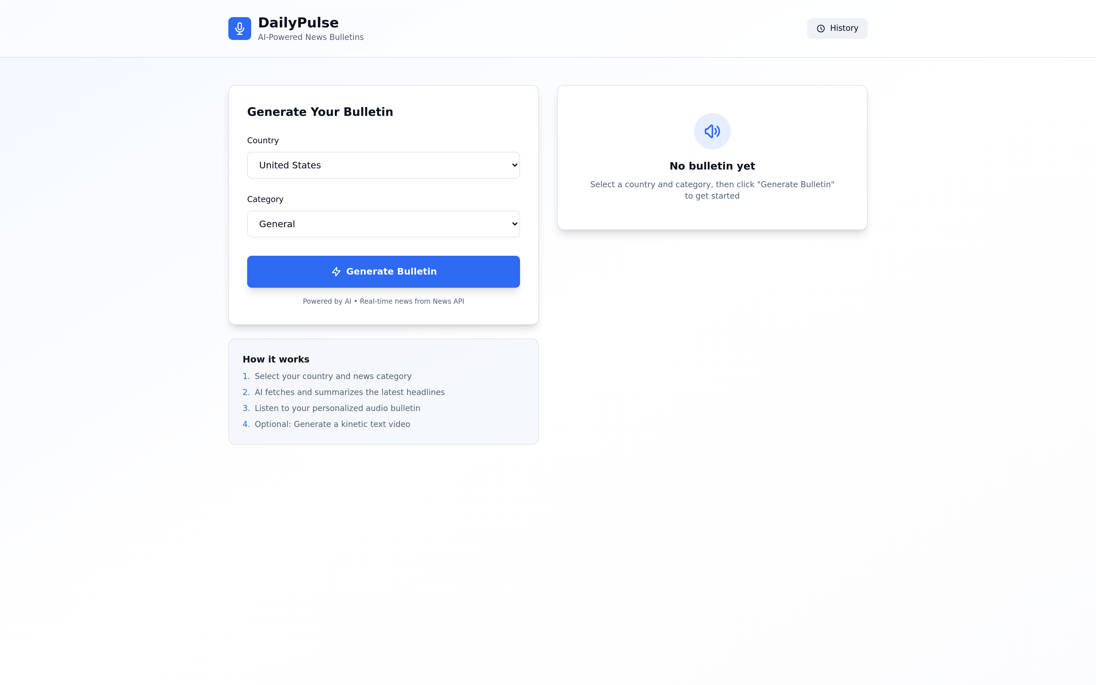 DailyPulse is a full-stack web application that delivers personalized daily news briefings. Users can select their preferred country and news categories to receive the latest headlines, accompanied by an AI-generated audio bulletin and an optional AI video summary. Stay informed with concise, customizable news updates.
