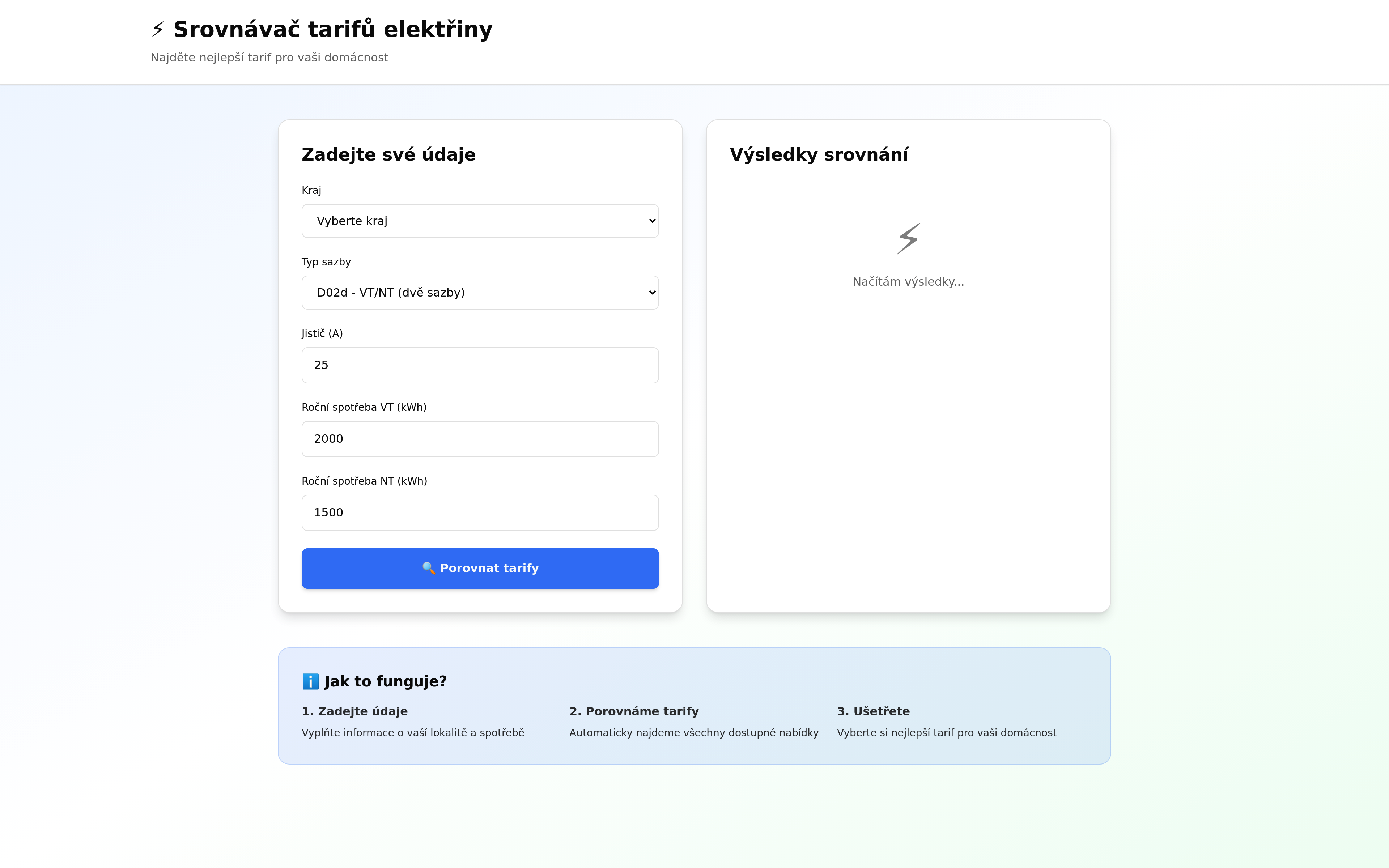 Compare electricity tariffs by region, circuit breaker rate, high and low tariff data. This web application allows users to input their location and energy consumption details to find the most suitable electricity plan. Key features include tariff comparison, data filtering, and saving user preferences for personalized recommendations.