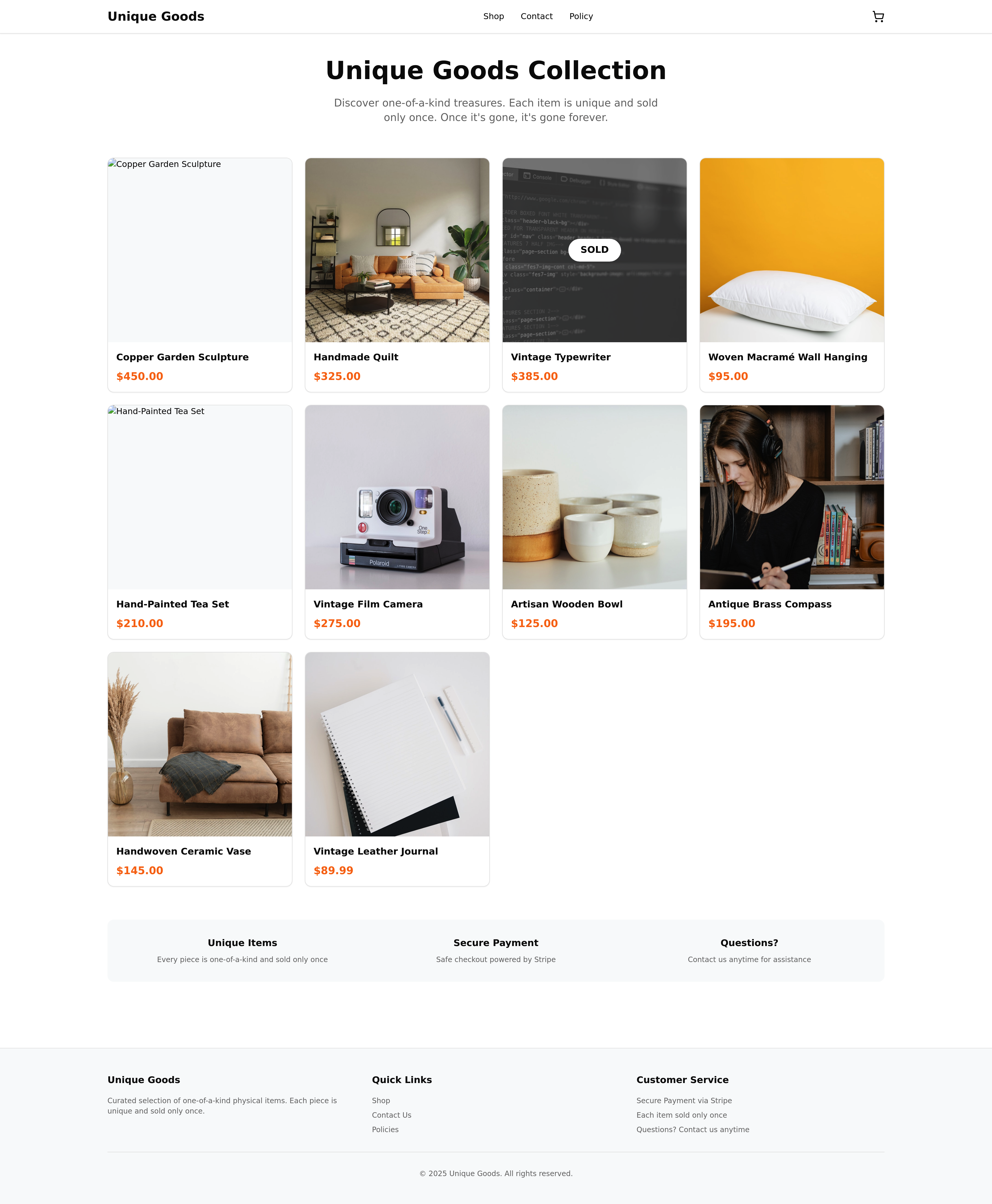 Launch your online store with this elegant e-commerce website template, designed for selling unique physical goods. Featuring a streamlined product showcase with dynamic image updates for sold items, a user-friendly customer form, and secure Stripe integration for all transactions. Perfect for artisans, boutiques, and individual sellers looking for a simple yet effective online presence.