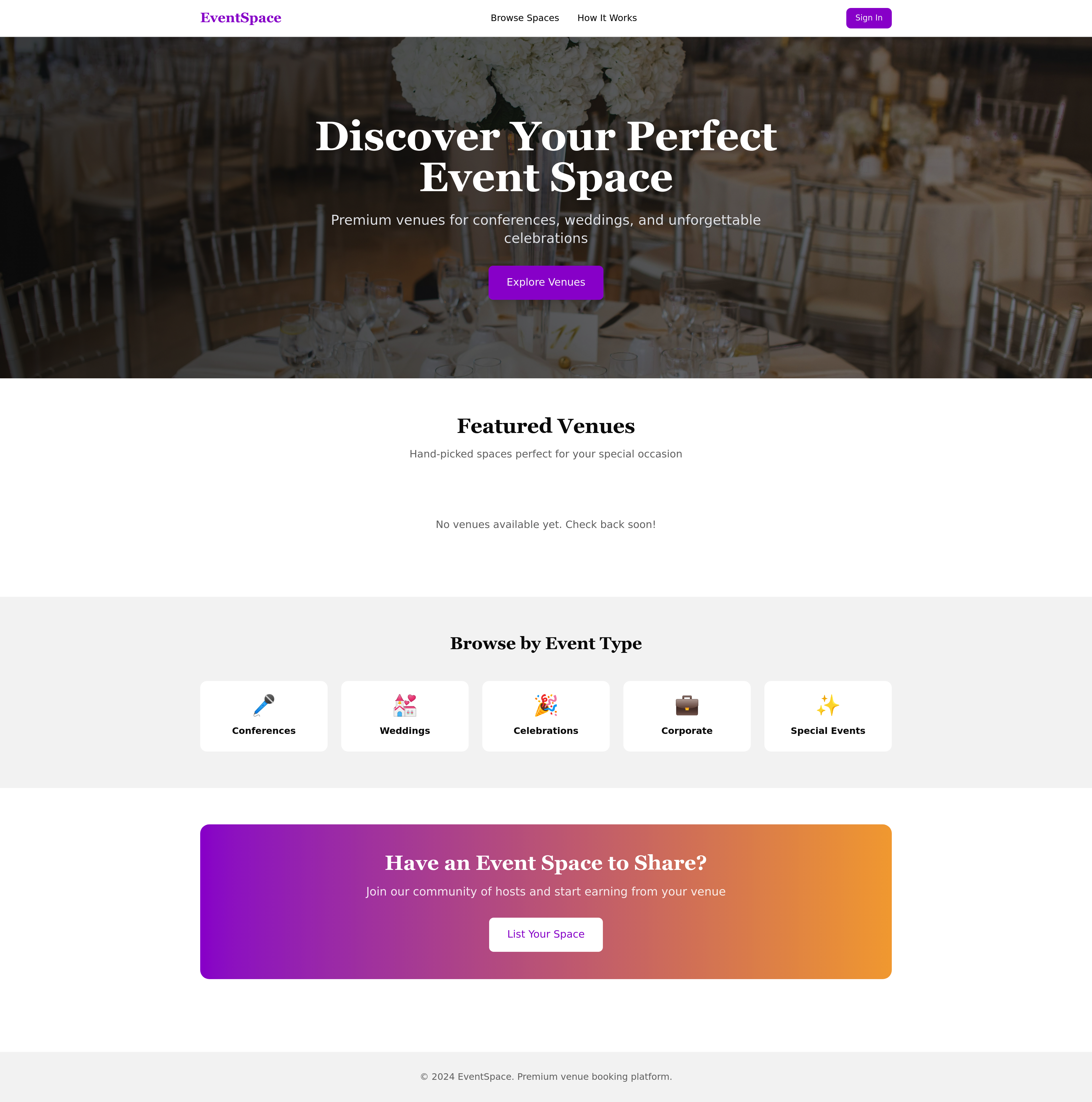 Discover and book unique venues for conferences, weddings, and celebrations with this intuitive web application. This platform connects event organizers with a diverse range of spaces, offering advanced search filters, secure booking, and seamless communication tools to plan unforgettable events.