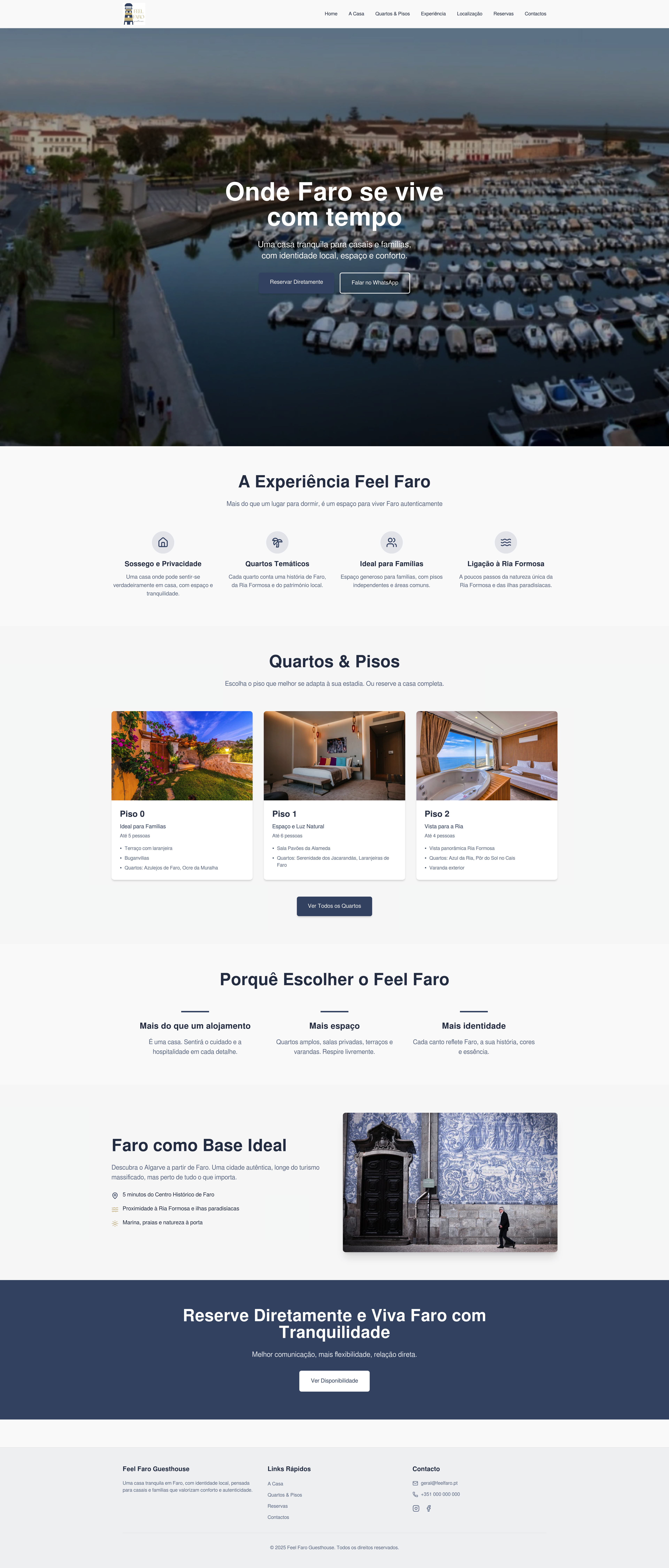 Discover Feel Faro Guesthouse, an elegant and tranquil retreat in Faro, Algarve, perfect for couples and families seeking a premium, authentic local experience. This multi-page website showcases themed rooms, independent floors, and direct booking options via the site and WhatsApp, reducing reliance on OTAs. Explore the serene atmosphere, local identity, and proximity to Ria Formosa and Faro's historic center. Book your direct stay for an unforgettable Algarve getaway.