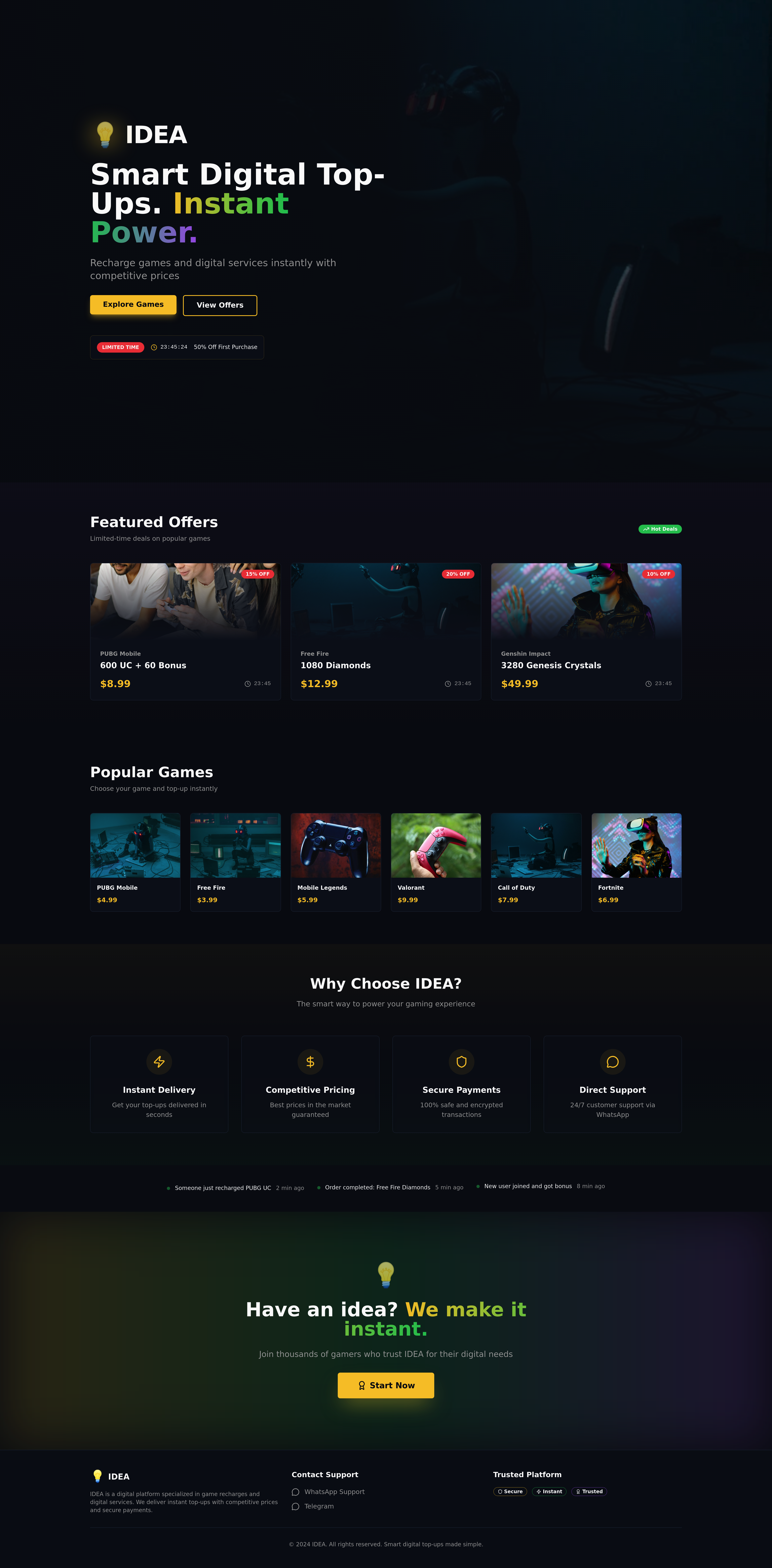 Explore IDEA, a modern digital gaming top-up and services platform offering instant game recharges, subscriptions, and digital offers. Enjoy competitive pricing, fast delivery, and secure payments for popular games like PUBG. Discover a cinematic hero section, featured offers with countdown timers, and a live activity feed for social proof. Experience a premium gaming-tech aesthetic with dark backgrounds, warm yellow/neon green accents, and smooth micro-interactions. Start recharging your games and digital services instantly with IDEA.