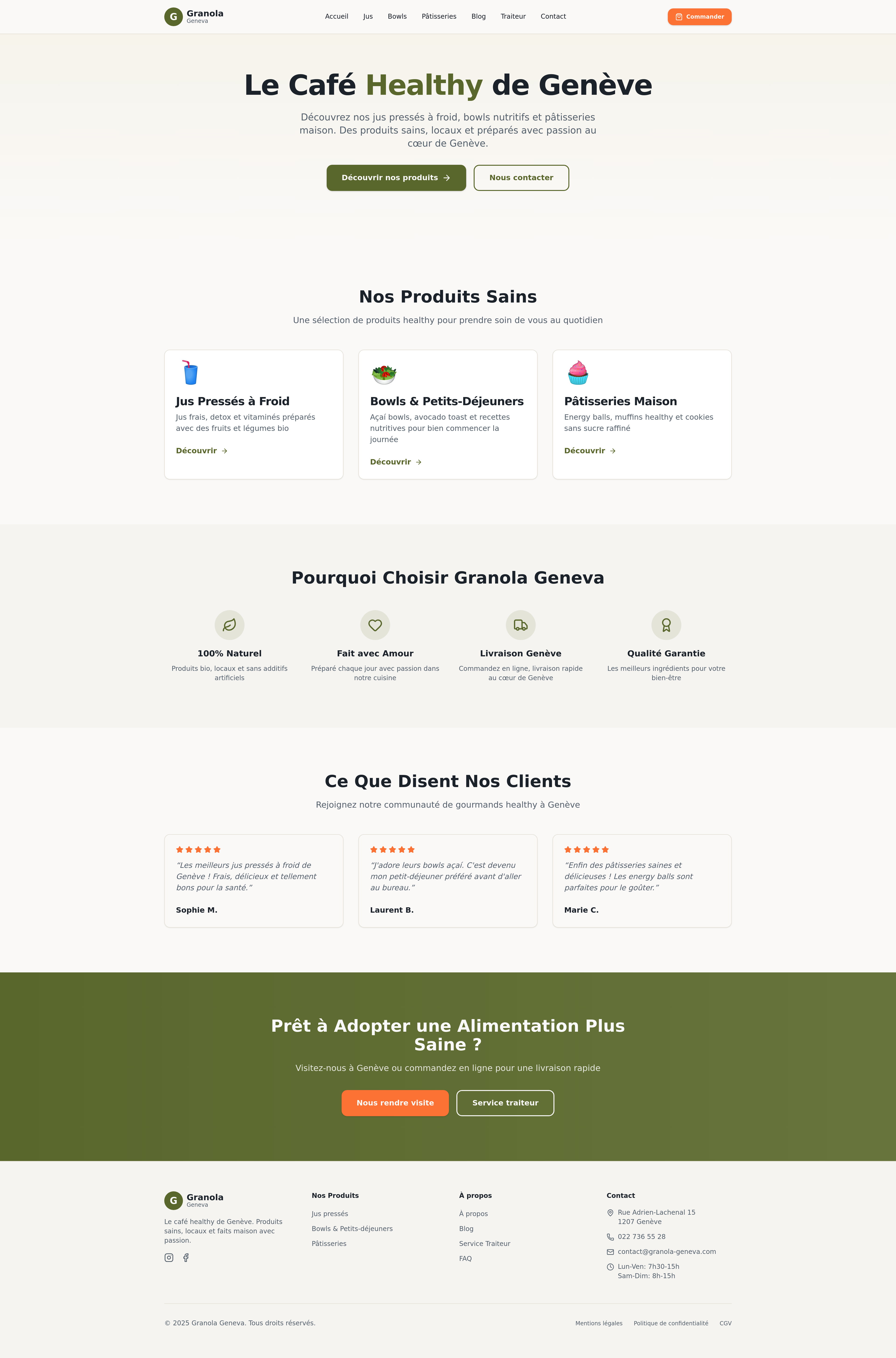 Granola Geneva: Discover a high-performance, SEO-optimized e-commerce website for Granola Geneva, a healthy cafe in Geneva. This multi-page site features cold-pressed juices, healthy bowls, homemade pastries, and catering services. Designed for mobile-first experience with comprehensive SEO, including keyword research, structured data, and a blog, to drive conversions and local search visibility for healthy food and catering in Geneva.