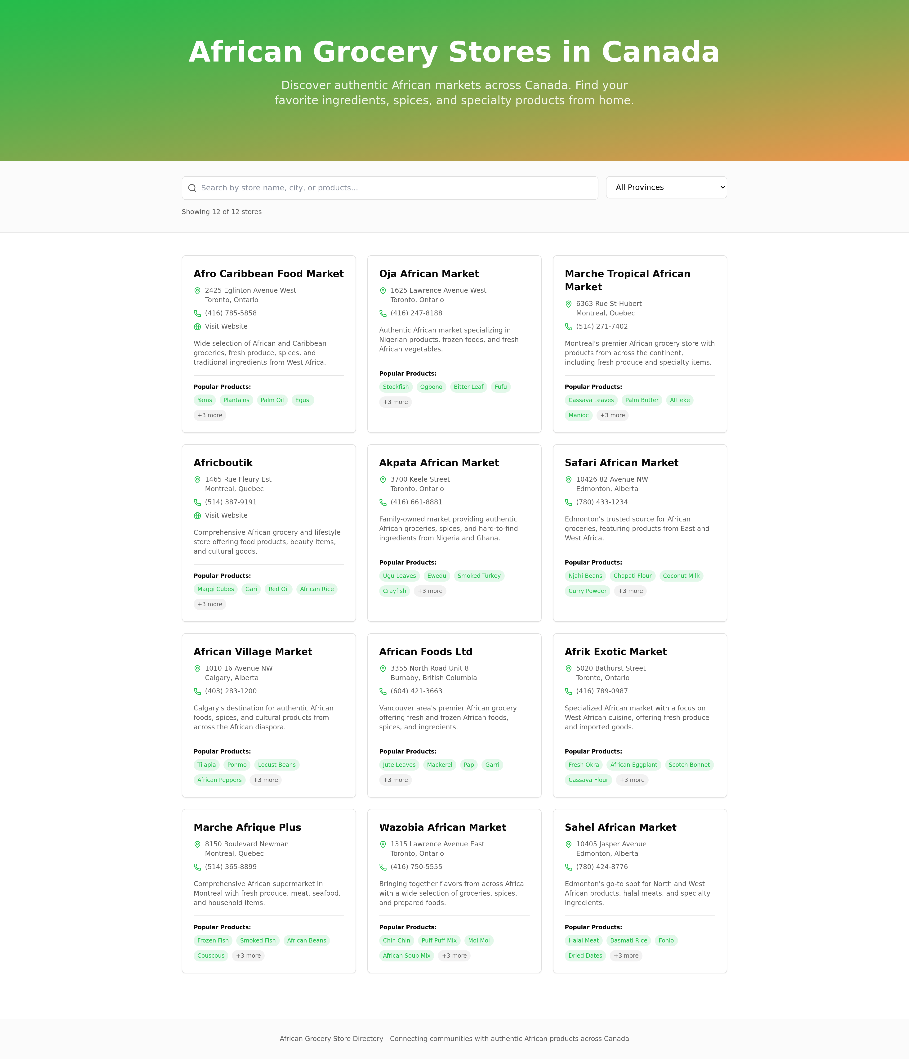Discover and locate African grocery stores across Canada with this comprehensive online directory. Find authentic African food products, spices, and ingredients near you. This platform connects customers with local businesses, making it easy to support and explore diverse culinary options.