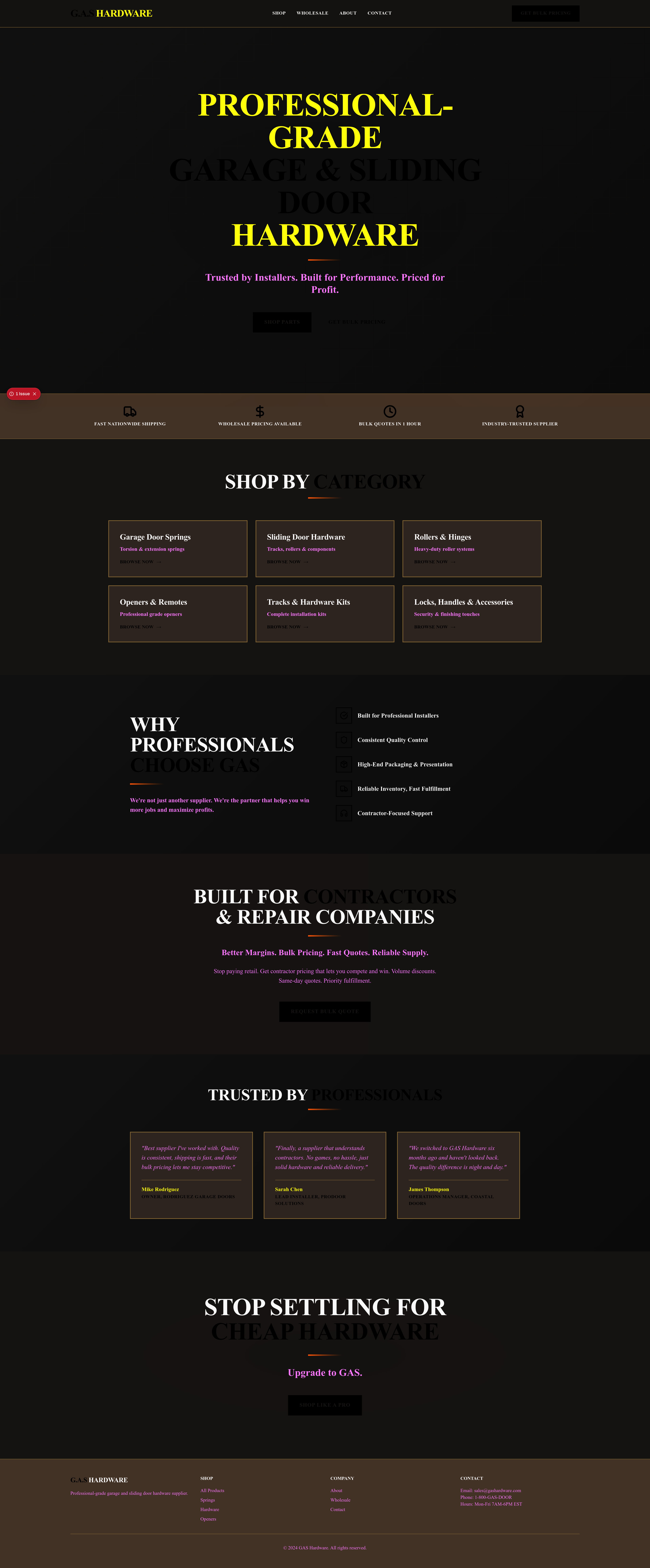GAS Hardware: America's #1 trusted supplier of professional-grade garage door and sliding door hardware. This B2B e-commerce platform offers a bold, industrial-luxury experience for installers, contractors, and DIY professionals, featuring wholesale pricing, fast nationwide shipping, and a comprehensive range of high-quality parts. Built for performance and profit, the site showcases premium products, bulk order options, and contractor-focused support in a visually dominant, high-contrast design.