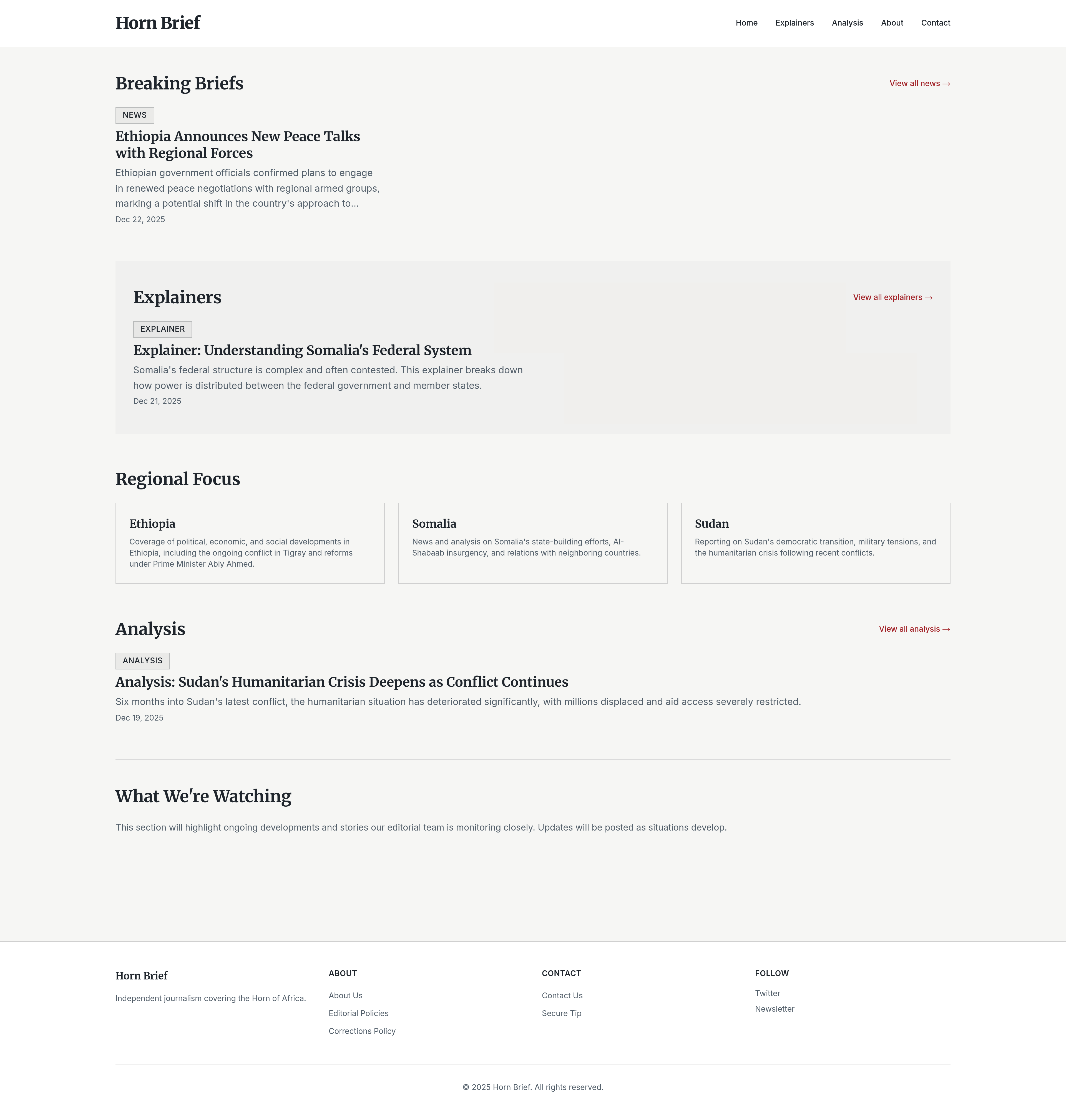 Horn Brief is a journalism-first news website template designed for independent publications. This Webflow and Next.js project emphasizes credibility, neutrality, and clarity, offering a clean, mobile-first design with robust CMS integration for articles, countries, and topics. Key features include dynamic homepage layouts for breaking news, explainers, and analysis, detailed article pages with transparency notes and correction blocks, and a focus on accessibility and performance. Ideal for news organizations seeking a professional, institutional online presence.