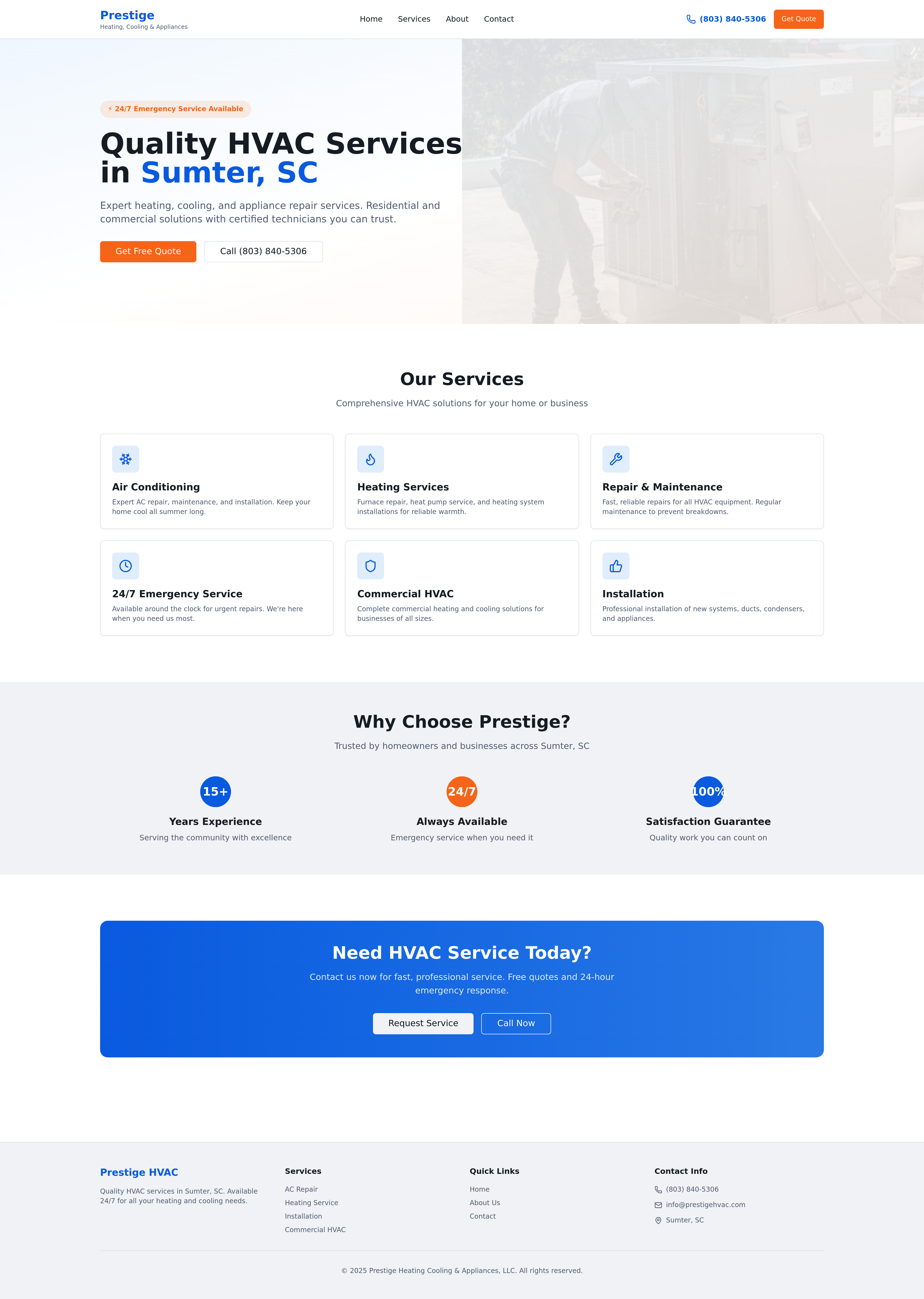 Prestige Heating Cooling & Appliances, LLC offers 24-hour HVAC services in Sumter, SC. This business website provides comprehensive solutions for AC repair, heating, residential and commercial installations, ductwork, and Freon services. Contact them for reliable air conditioning and heating expertise.