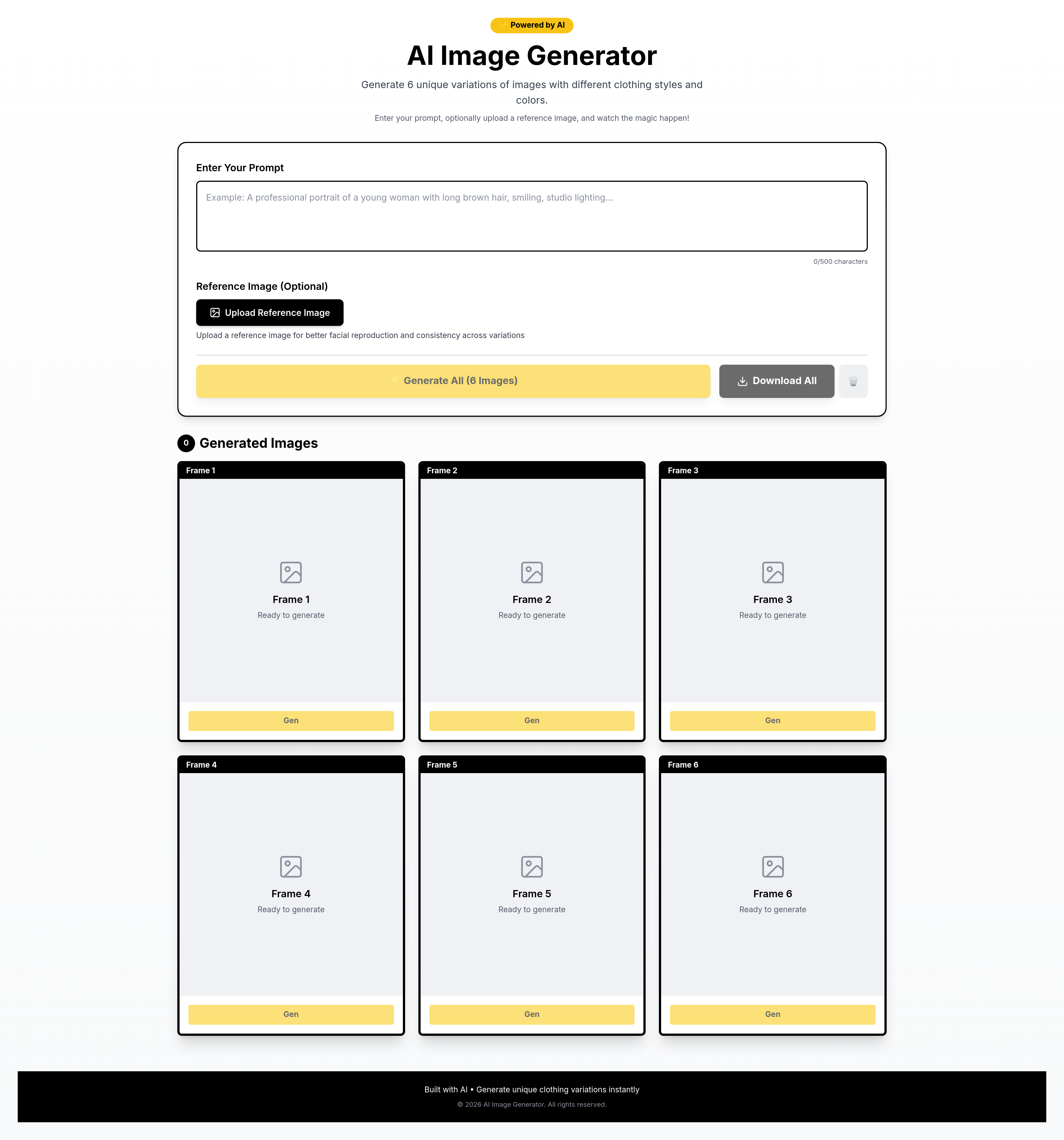 Generate realistic images from text prompts with this AI image generation web application. Featuring a clean, intuitive interface, users can easily create and edit images, upload full-size images for facial reproduction, and generate up to six variations with different clothing colors and styles simultaneously. Download individual images or all results as PNG files. No login required.