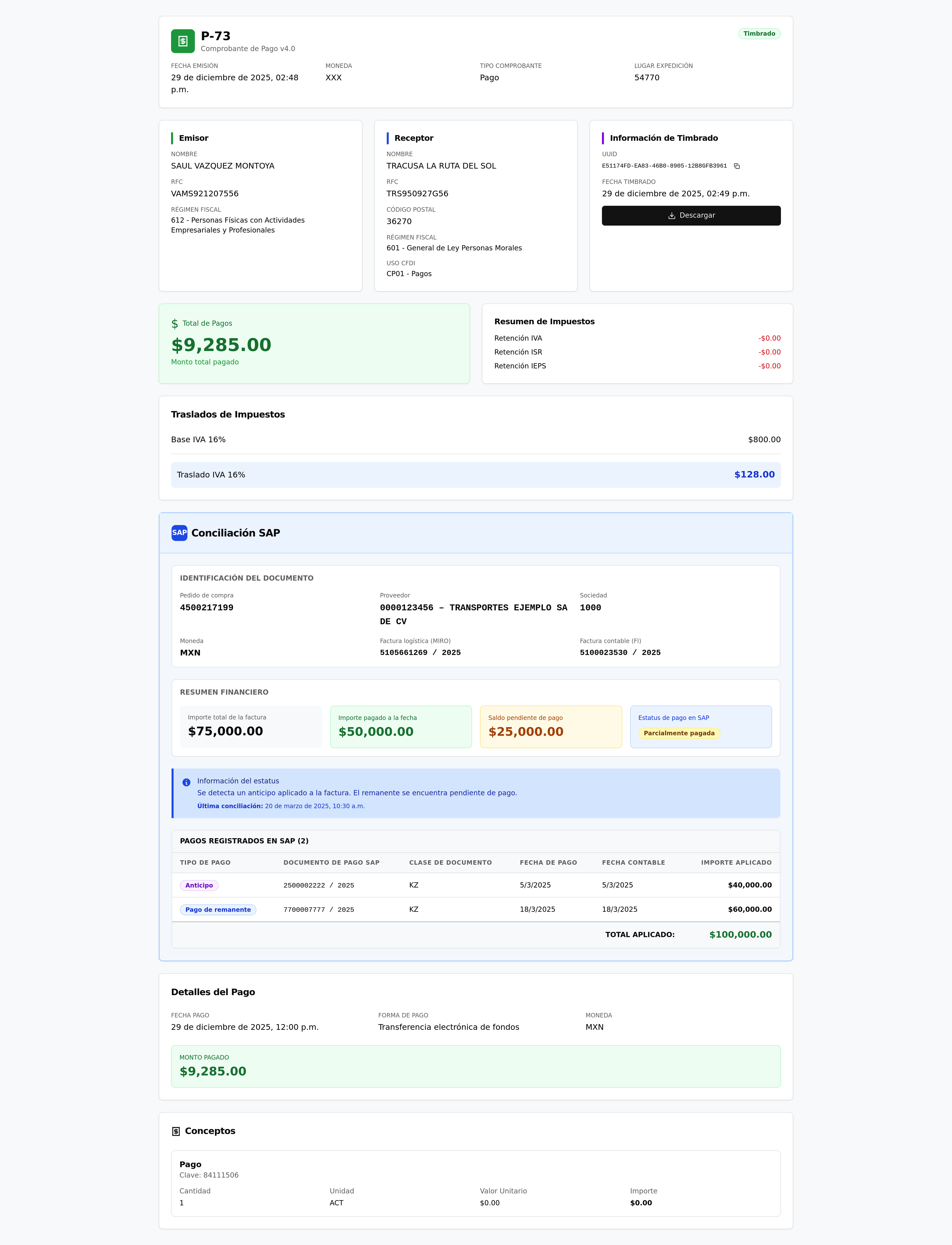 This web application provides a comprehensive invoice reconciliation system, integrating with SAP for detailed payment tracking. Users can view invoice status, payment history (anticipos, remanentes, pago único), and reconciliation messages. Built with React, Shadcn, and Tailwind CSS, it offers a modern and responsive user experience for financial management.