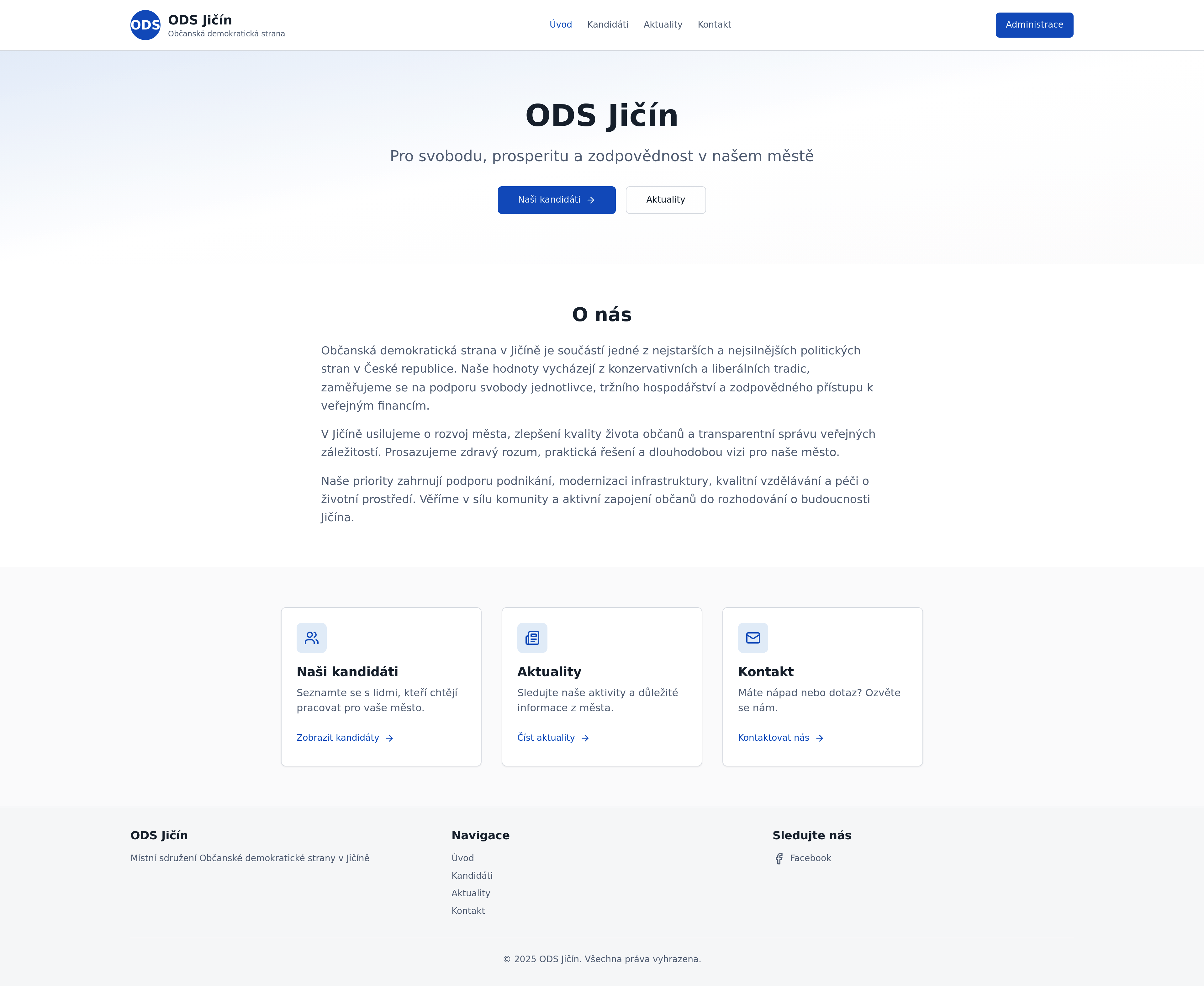 Official website for the ODS political association in Jičín. Features candidate profiles, a blog for news and updates, an introductory page about ODS Jičín, and a contact section. Includes a footer link to their Facebook page. This political website serves as a central hub for local political information and community engagement.