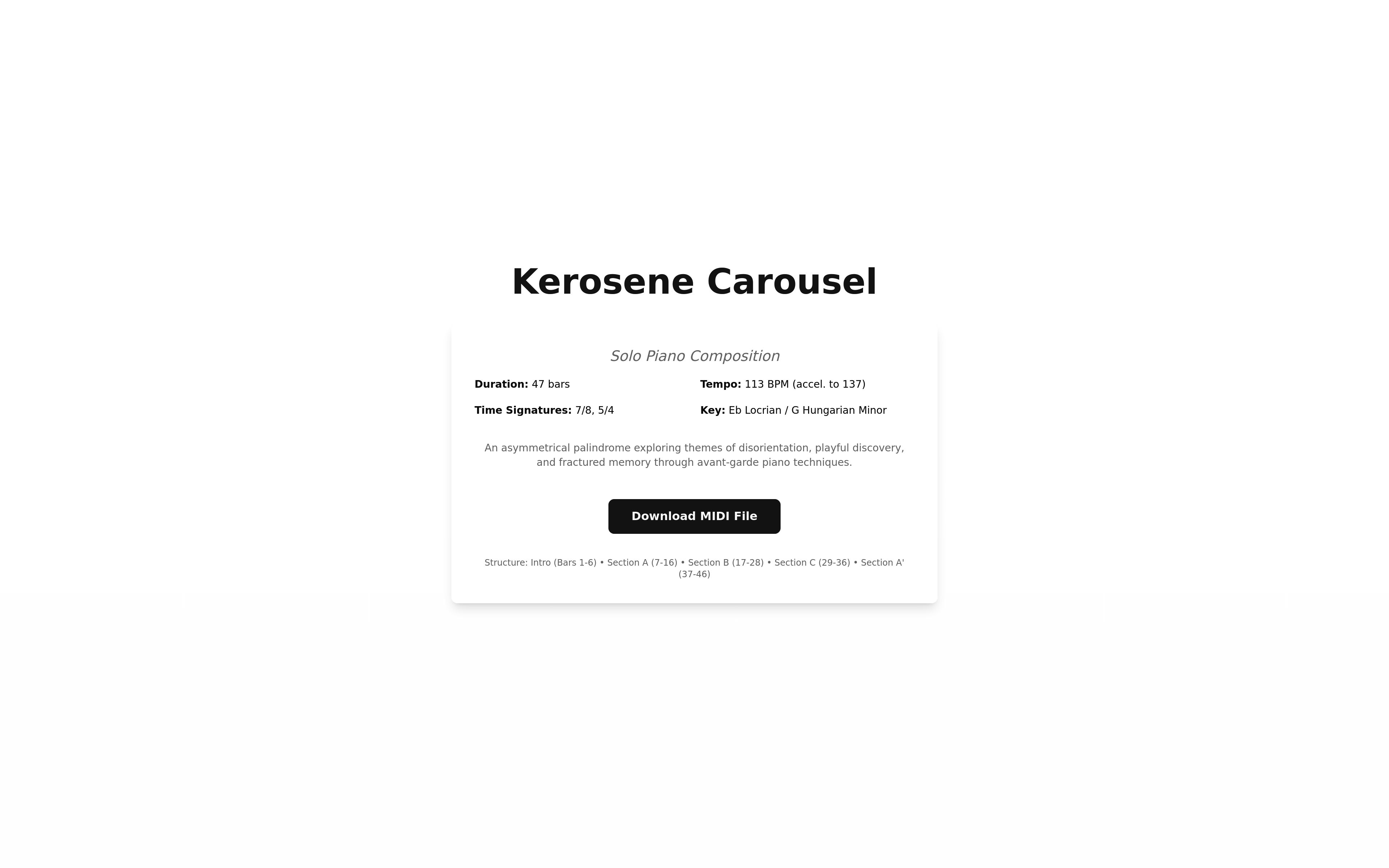Explore "Kerosene Carousel," a solo piano composition featuring an asymmetrical palindrome structure. This piece uses fractured mirror logic, reinterpreting musical themes with altered harmonies and rhythmic displacements to evoke memory and playful distortion. Experience a unique blend of classical and experimental piano techniques, perfect for those interested in contemporary classical music, piano compositions, and innovative musical structures.