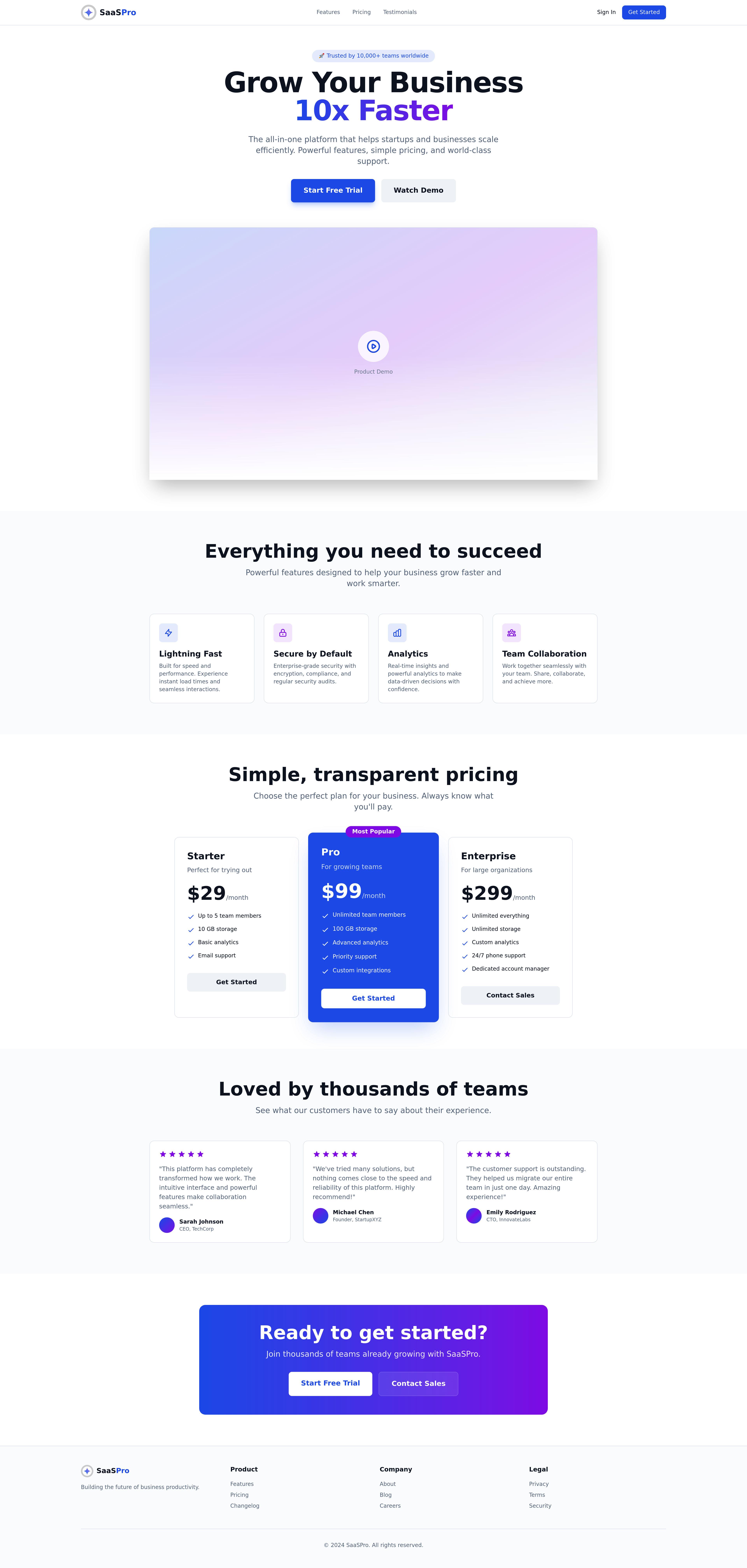 A modern and high-converting SaaS landing page template designed to transform visitors into loyal customers. Features a compelling hero section, detailed feature breakdowns, transparent pricing plans, and persuasive customer testimonials. Ideal for showcasing software products and driving sign-ups.