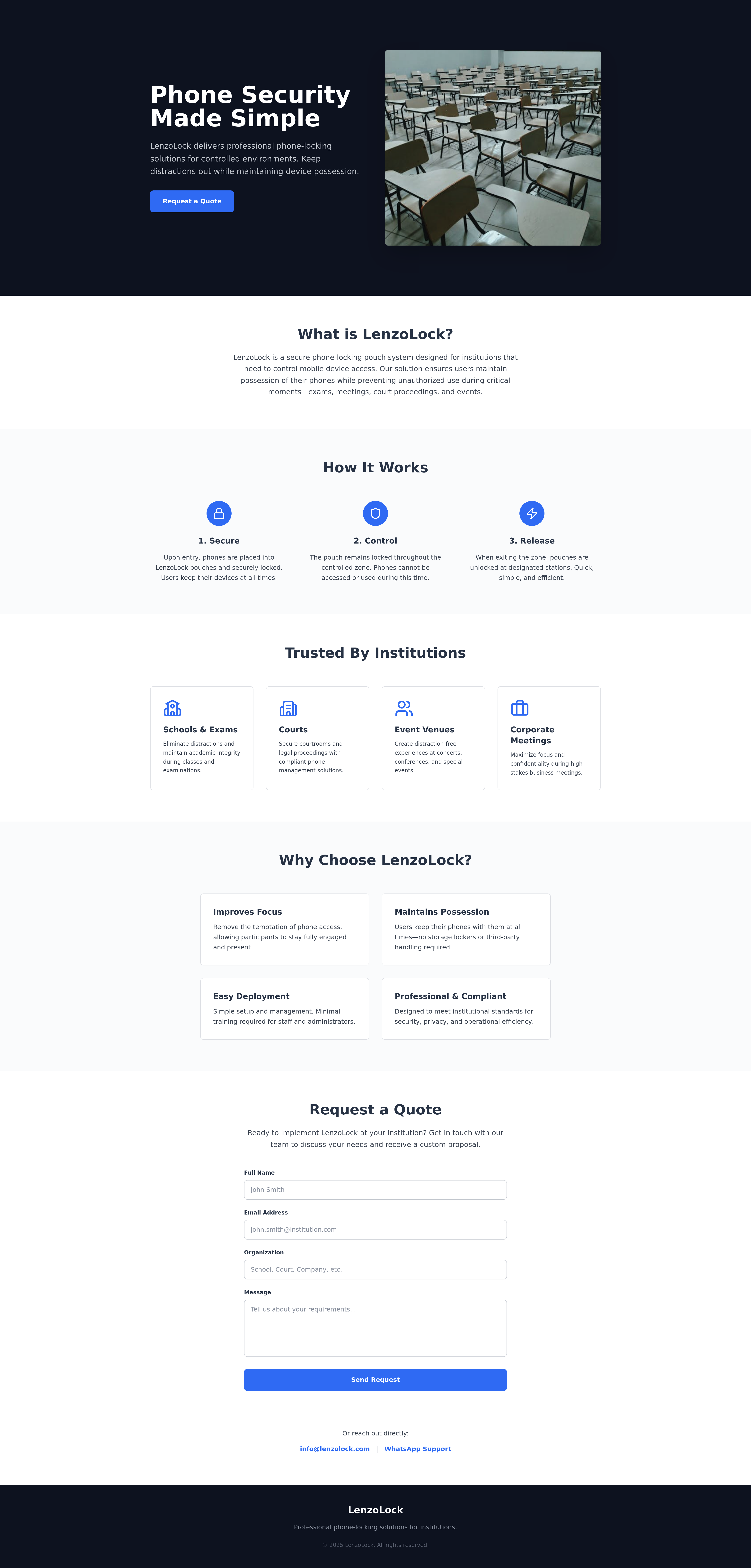 LenzoLock offers secure phone-locking pouches for controlled environments like schools, exam halls, courts, event venues, and corporate meetings. This professional landing page highlights product features, use cases, and benefits, focusing on improving focus and maintaining security. Ideal for institutions seeking a trustworthy and compliant solution for phone distraction and security.
