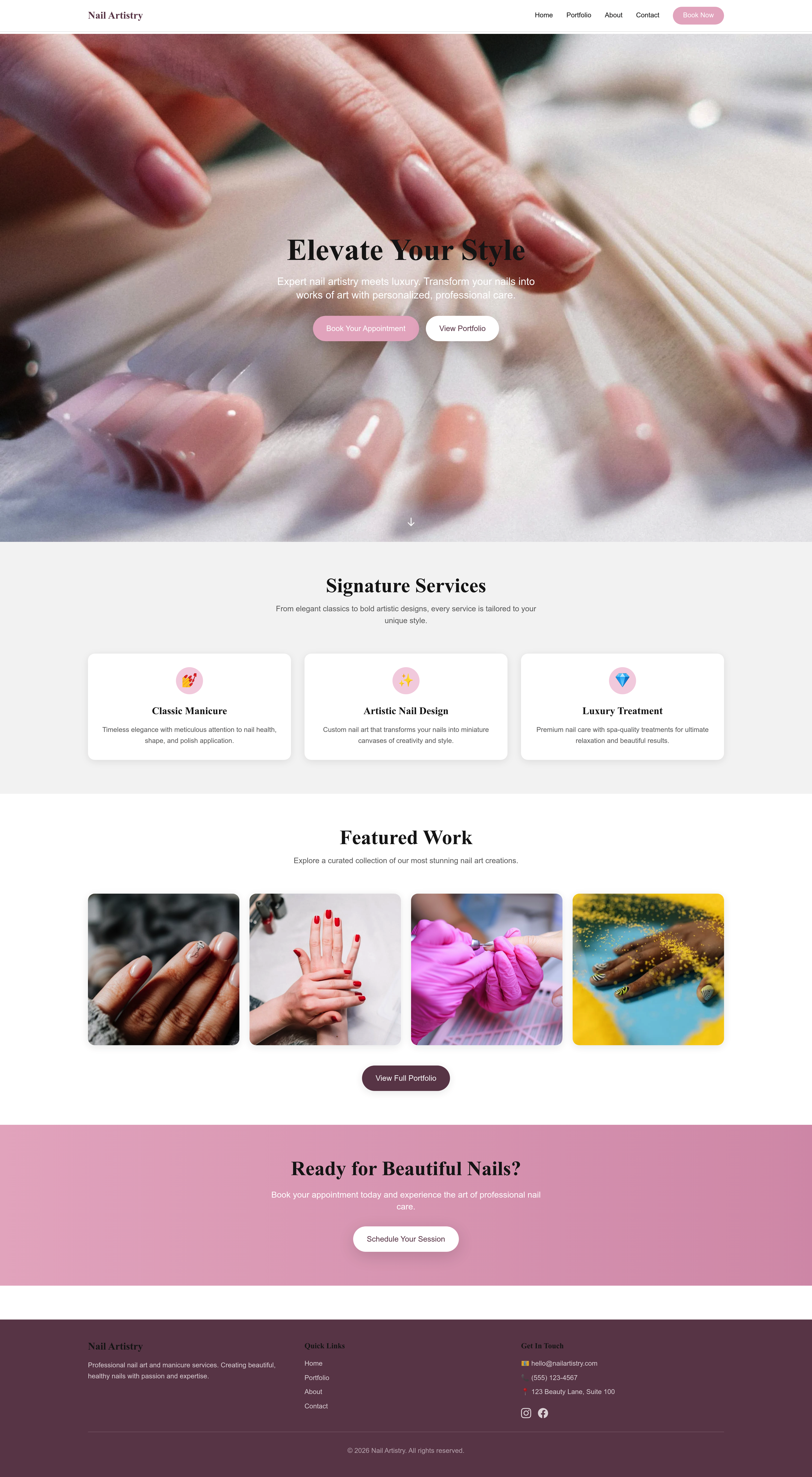 Showcase your stunning nail art designs with a professional online portfolio. Perfect for freelance nail artists and salons, this website highlights your best work, services, and contact information to attract new clients and grow your beauty business.