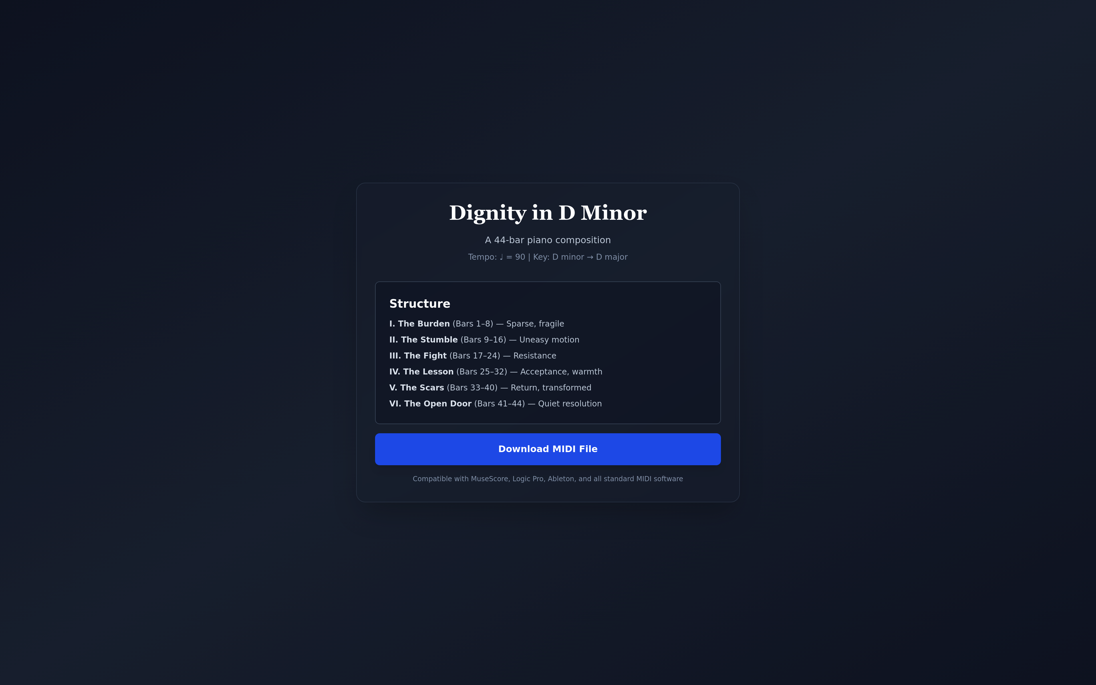 Explore "Dignity in D Minor," a 44-bar piano composition designed for introspection and emotional depth. This piece, perfect for classical and contemporary music enthusiasts, features a restrained yet powerful narrative through its D minor harmonies, subtle rubato, and dynamic shifts. Discover a unique blend of modal ambiguity, expressive phrasing, and a poignant Tierce de Picardie resolution. Ideal for piano students, composers, and those seeking evocative instrumental music.