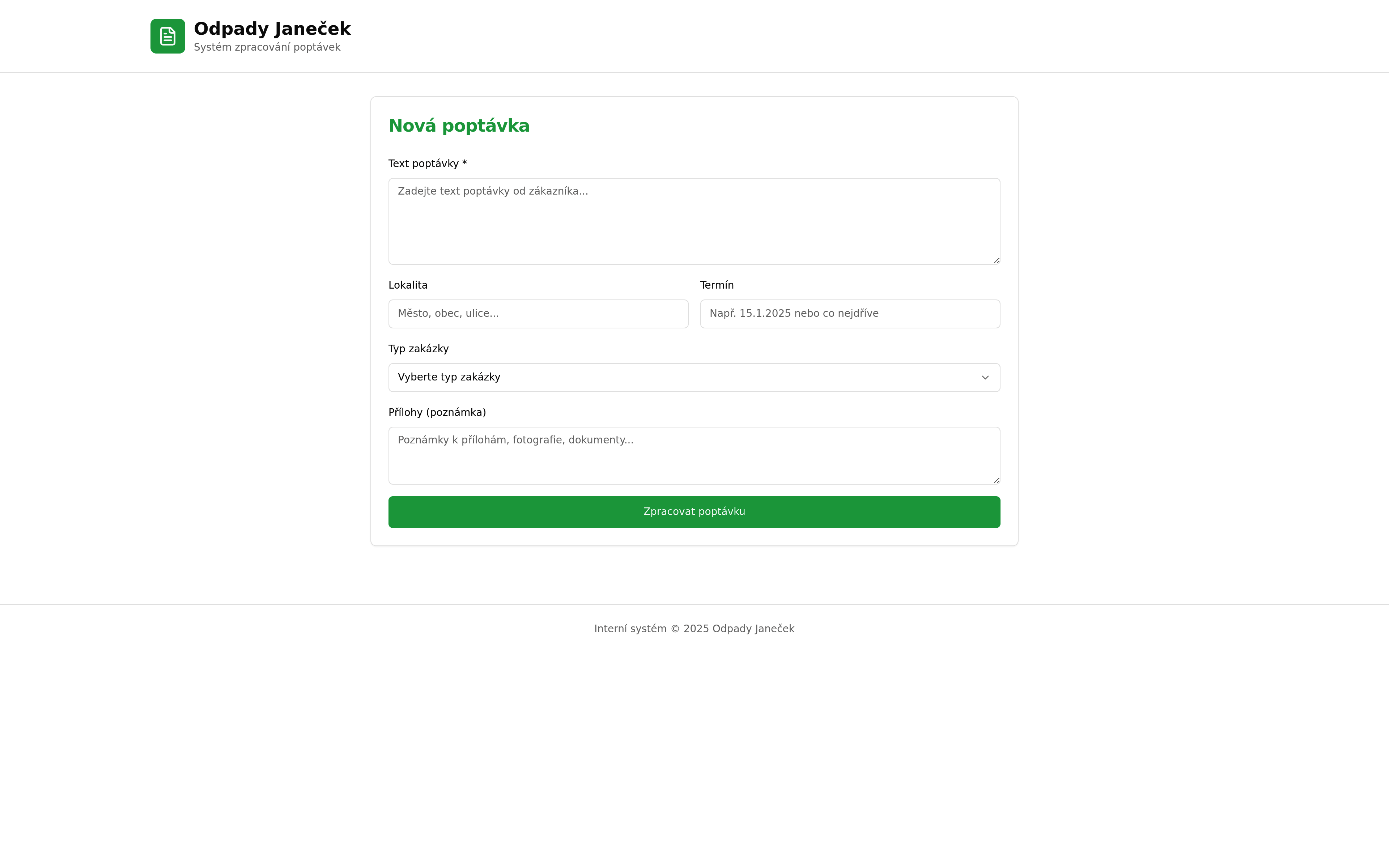 This project outlines an internal assistant for "Odpady Janeček," a waste management company. The assistant is designed to process inquiries related to containers, demolitions, and general waste. It focuses on structuring incoming requests by summarizing known information, identifying gaps, listing items for pricing, assessing risks, and defining next steps with assigned ownership. This tool streamlines the inquiry handling process for dispatchers, estimators, and technicians.