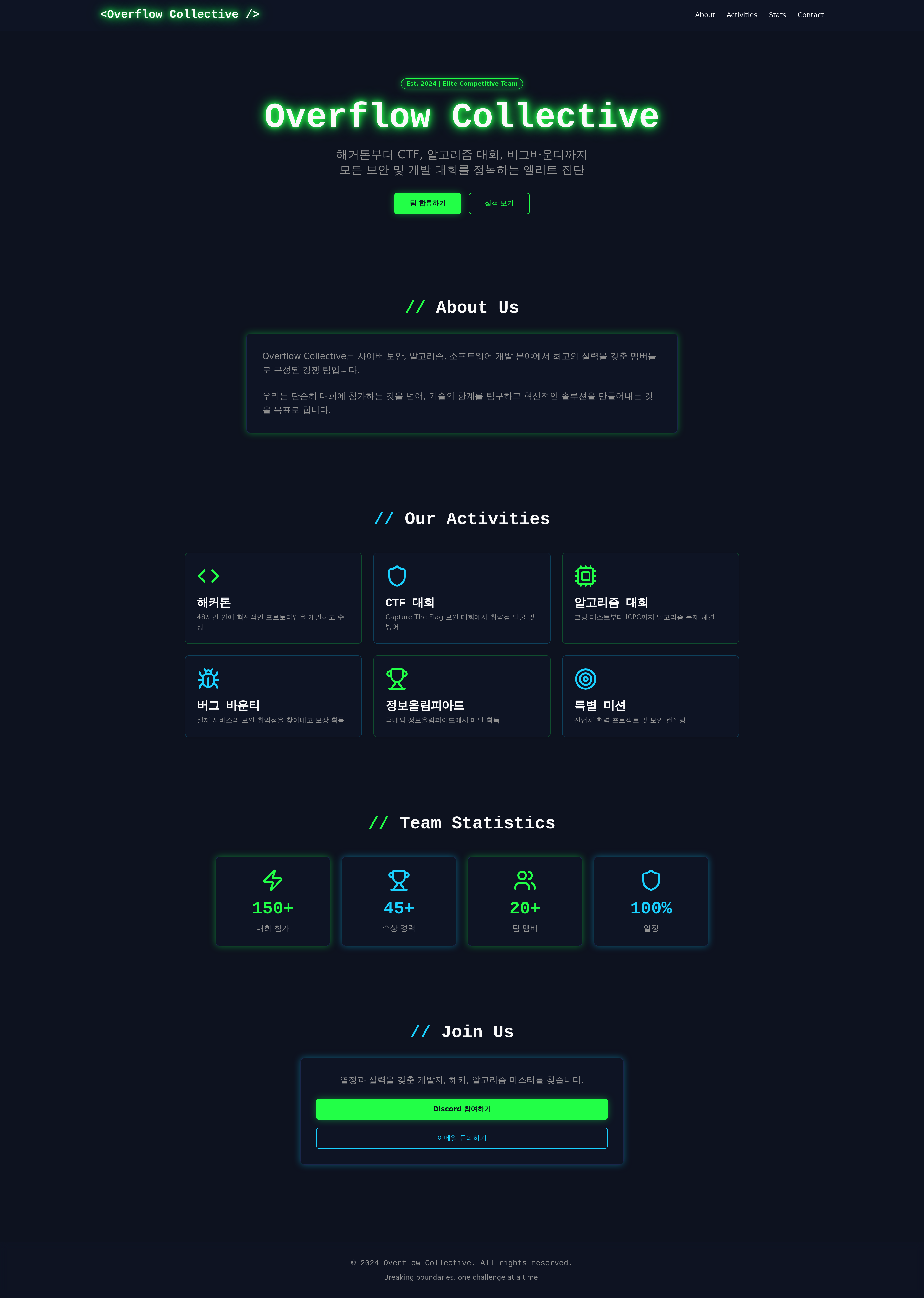 Overflow Collective is a dynamic community website for cybersecurity and programming competition enthusiasts. It serves as a central hub for members participating in hackathons, CTF contests, algorithm competitions, bug bounties, and informatics Olympiads. This platform showcases team achievements, facilitates collaboration, and provides resources for competitive programming and cybersecurity challenges.