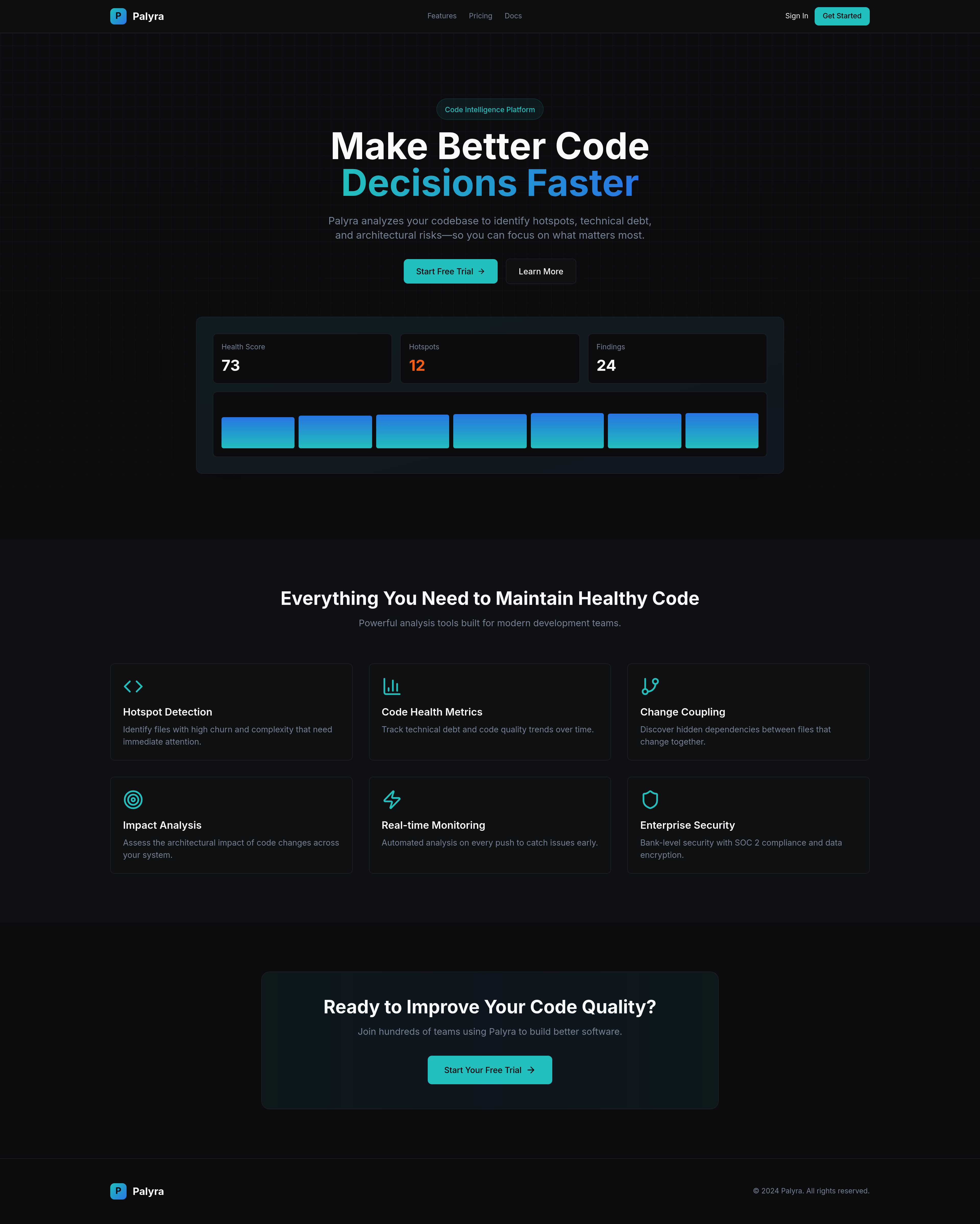 A comprehensive demo site for Palyra, an AI website building platform, showcasing a production-grade UI with a dark theme, dense data visualizations, and interactive elements. Features include KPI dashboards, code health analysis, impact mapping, and agent management, all powered by mock data for a seamless user experience.