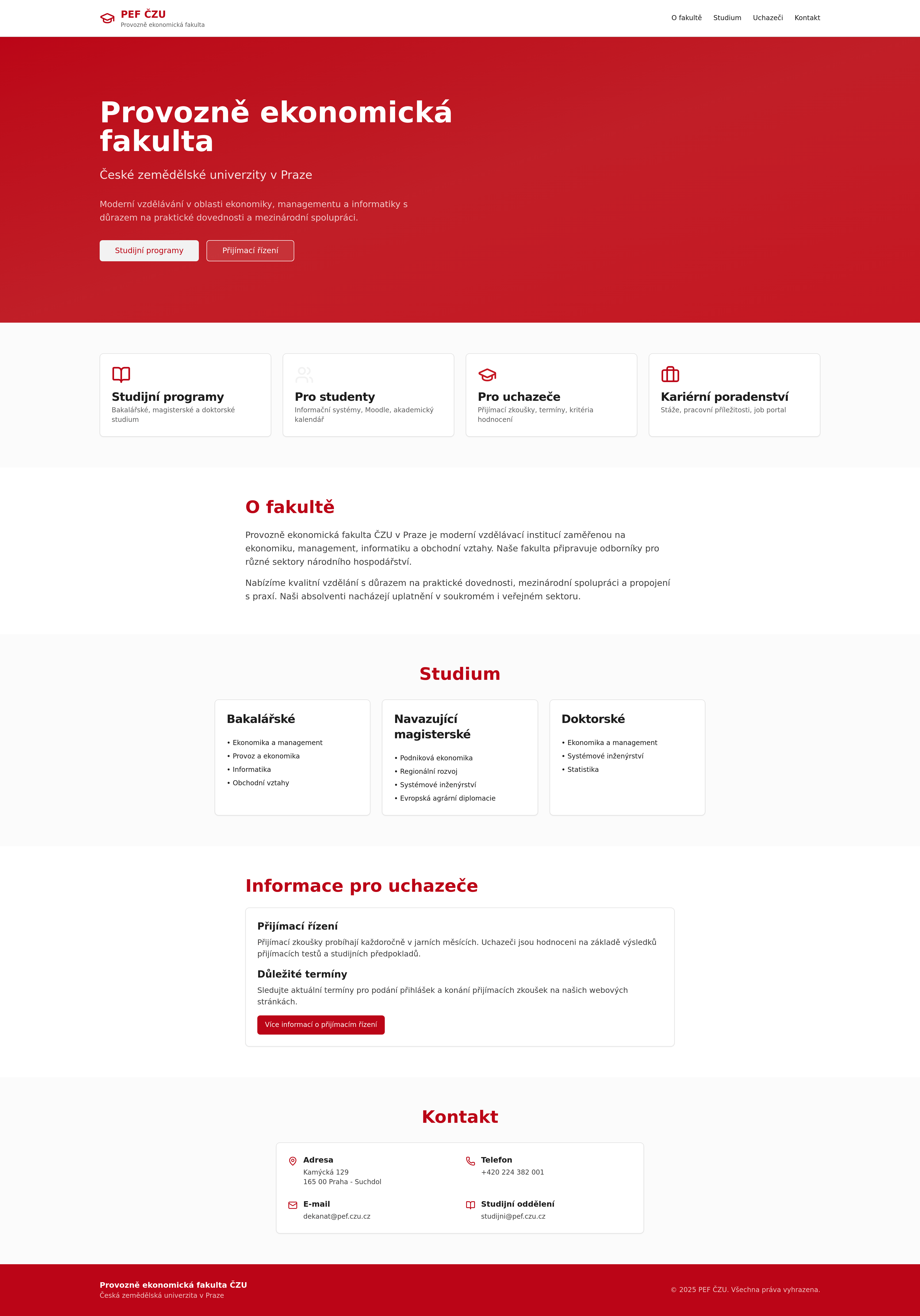 Explore a responsive, modern landing page concept for pef.czu.cz, designed with the faculty's official colors. This redesign maintains all existing content while enhancing user experience across all devices. Ideal for educational platforms and university faculty websites seeking a fresh, engaging online presence.