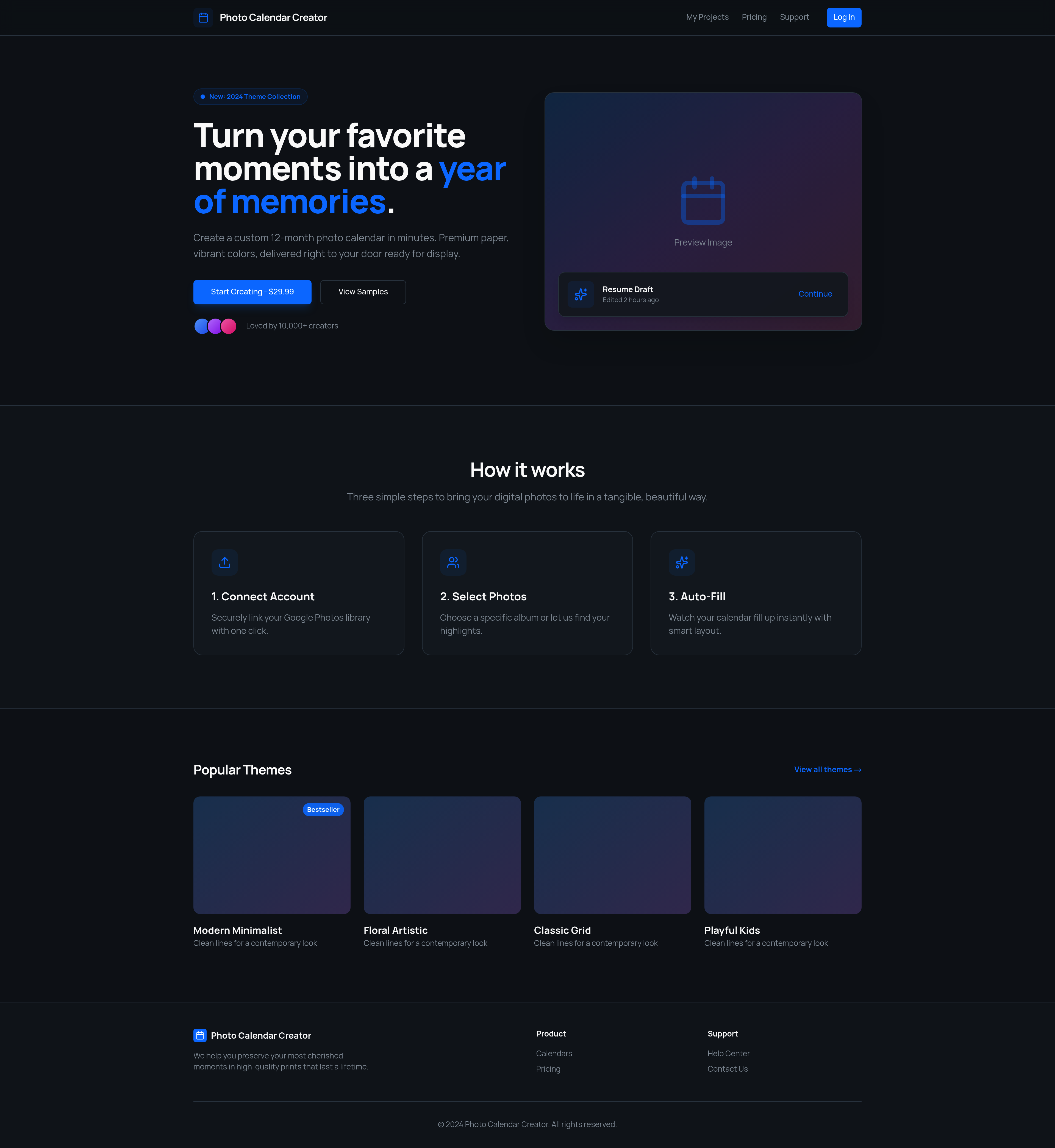 Create a personalized 12-month photo calendar for printing. This web application allows users to connect with their Google Photos library, select specific individuals, and automatically filter photos to display only those featuring the chosen people. The app then intelligently curates the most compelling and high-quality images from the filtered collection, assigning one best photo per month to generate a beautiful, print-ready calendar. Perfect for custom gifts and cherished memories.