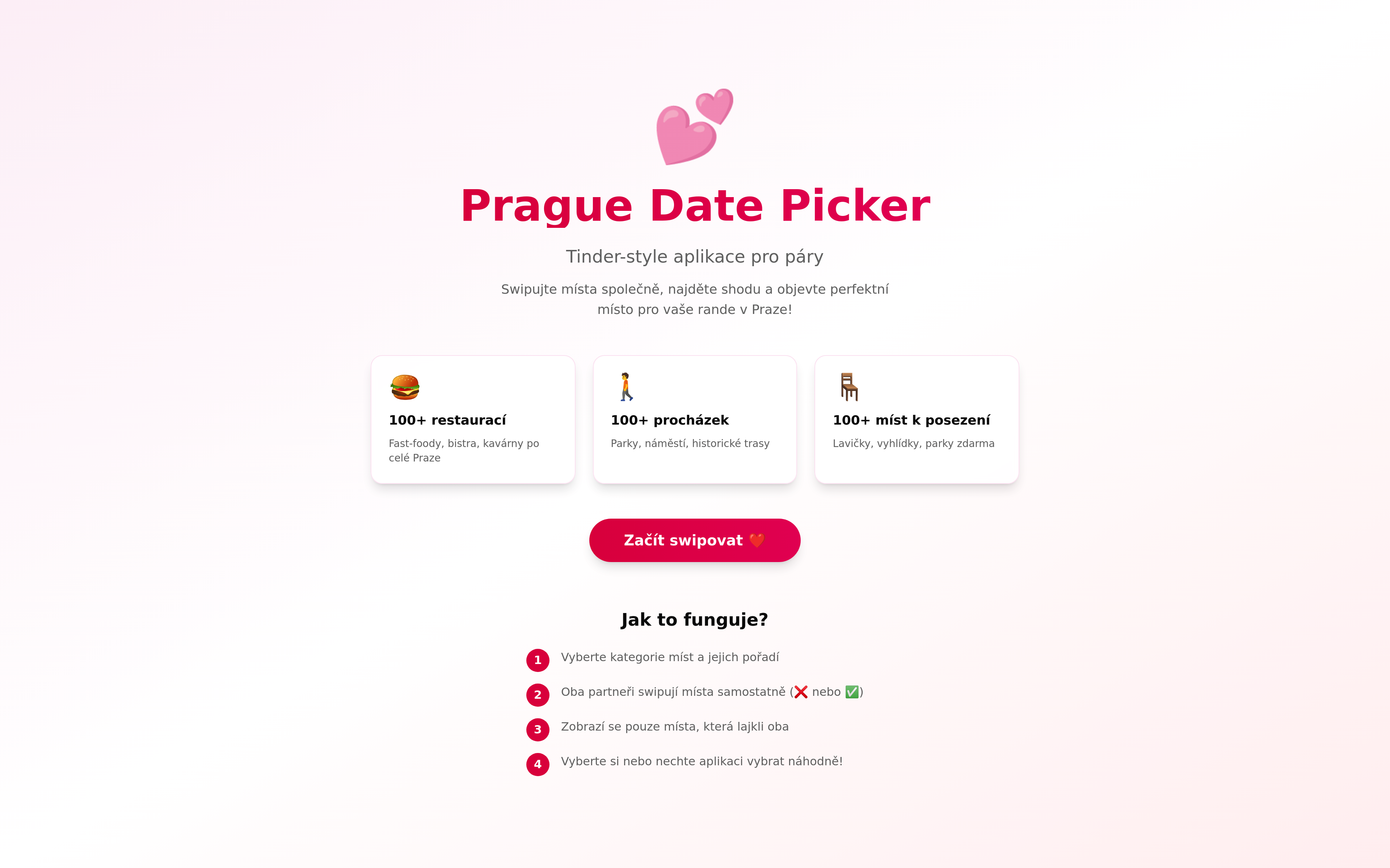 Discover Prague's best date spots with "Prague Date Picker," a Tinder-style web application for couples. Swipe through curated categories like food, walks, and scenic seating, filtering by location to find your perfect outing. This interactive platform helps couples decide where to go in Prague, offering detailed cards with photos, descriptions, and Google Maps integration for over 300 locations. Enjoy a fun, collaborative decision-making experience with your partner.