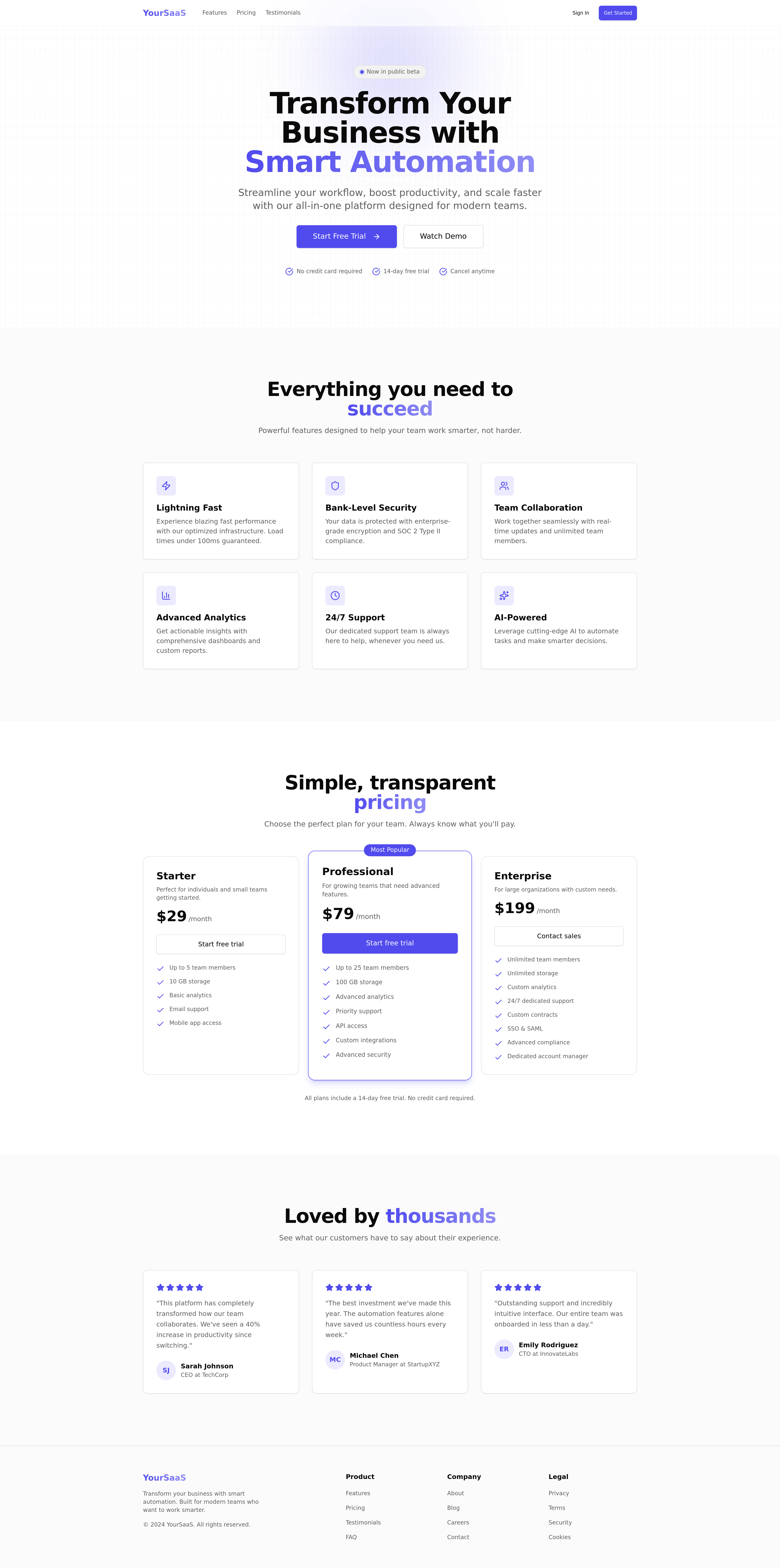 A modern and high-converting SaaS landing page template designed to transform visitors into loyal customers. Features a compelling hero section, detailed feature breakdowns, clear pricing plans, and persuasive customer testimonials to drive sign-ups and boost your software-as-a-service business.