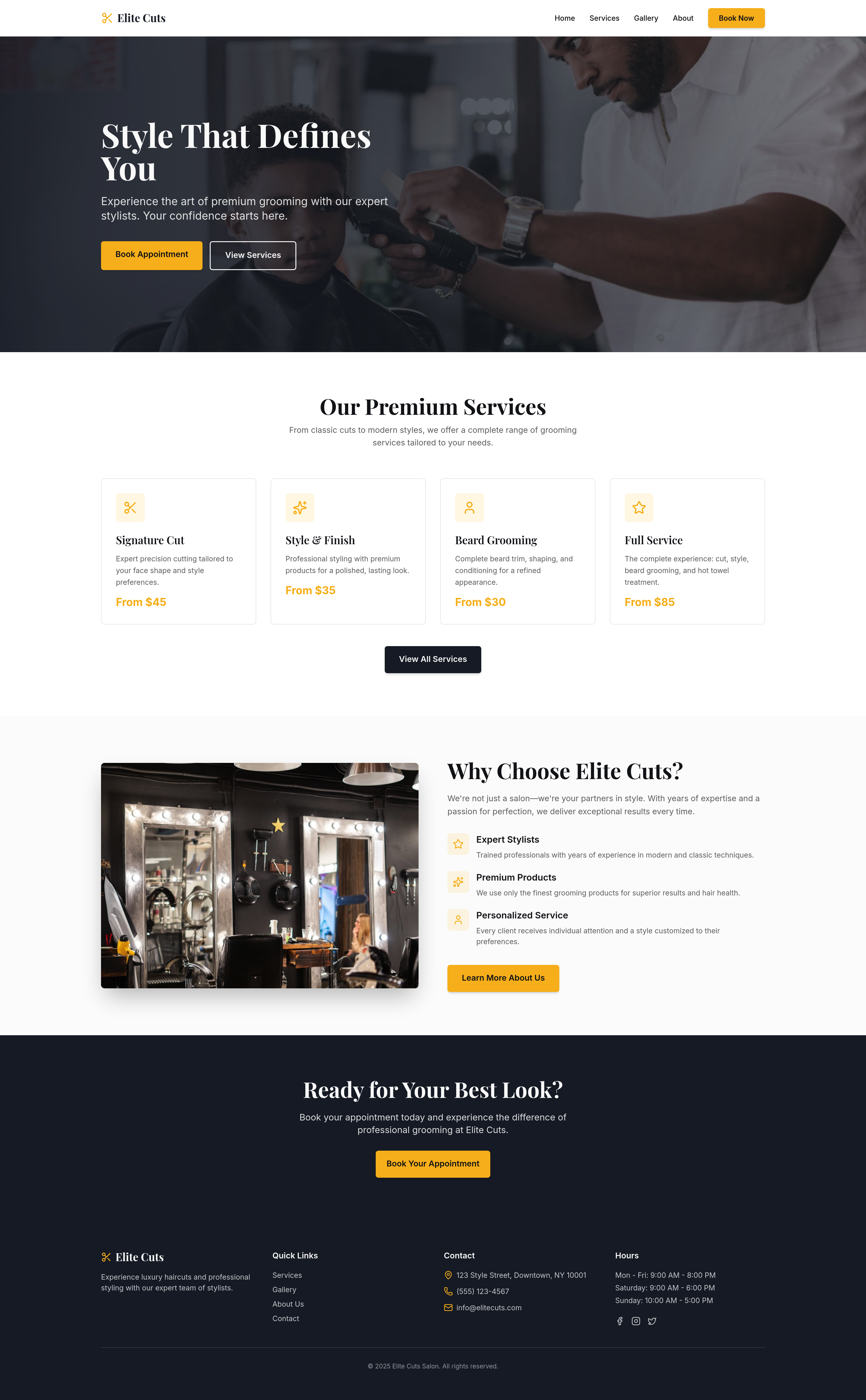 Showcase your salon with a stunning, fully-responsive website design. This template includes essential pages for services, pricing, booking appointments, and a gallery to highlight your stylists' work. Perfect for barbershops, hair salons, and beauty parlors looking to attract new clients and manage their online presence with ease.