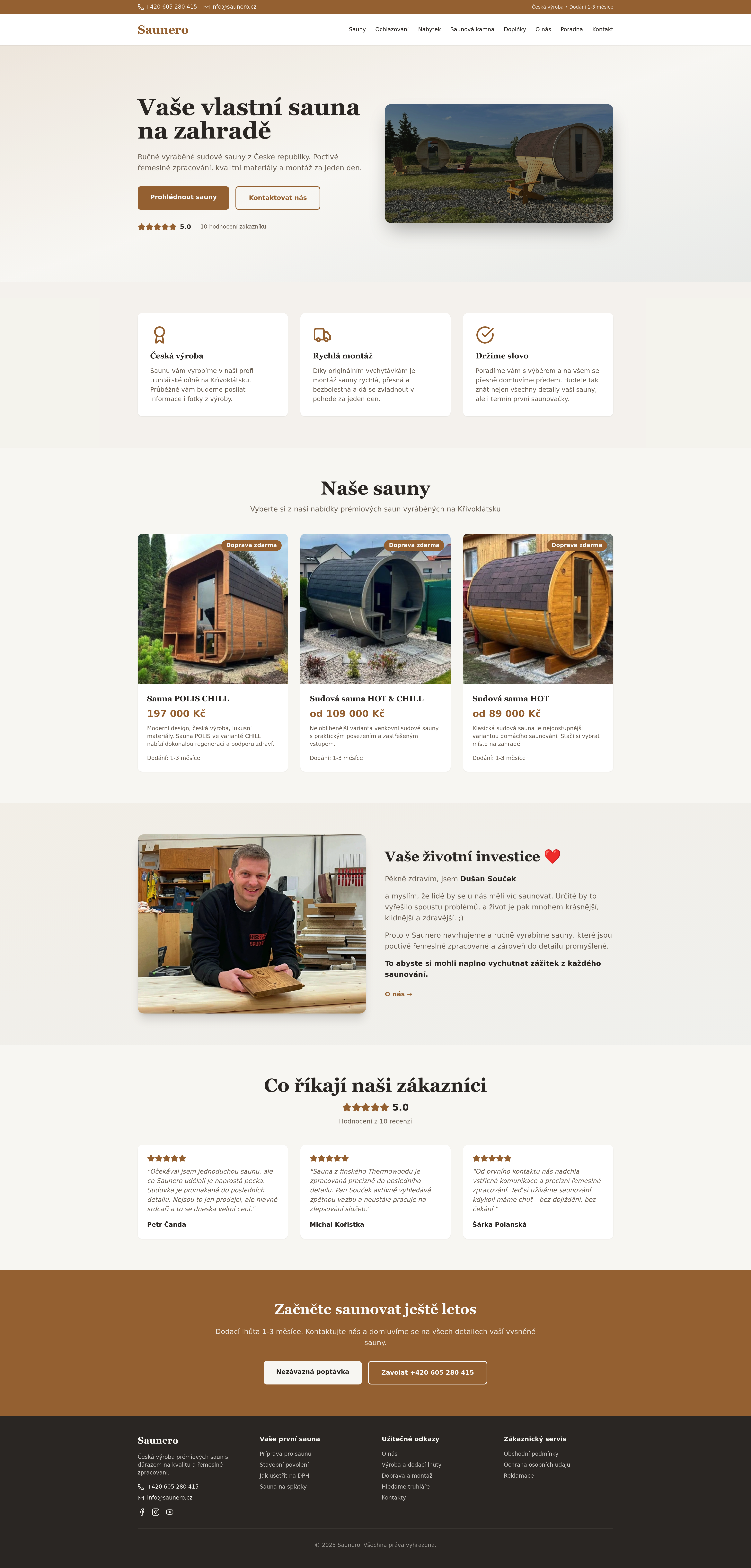 A modern, professional redesign of Saunero.cz, a business website specializing in saunas and wellness. This project focuses on an improved layout, enhanced user experience, and contemporary design principles, utilizing existing content and AI-generated imagery to reflect the brand's identity. Key features include a redesigned homepage, functional internal links, and clear indicators for sections under development.