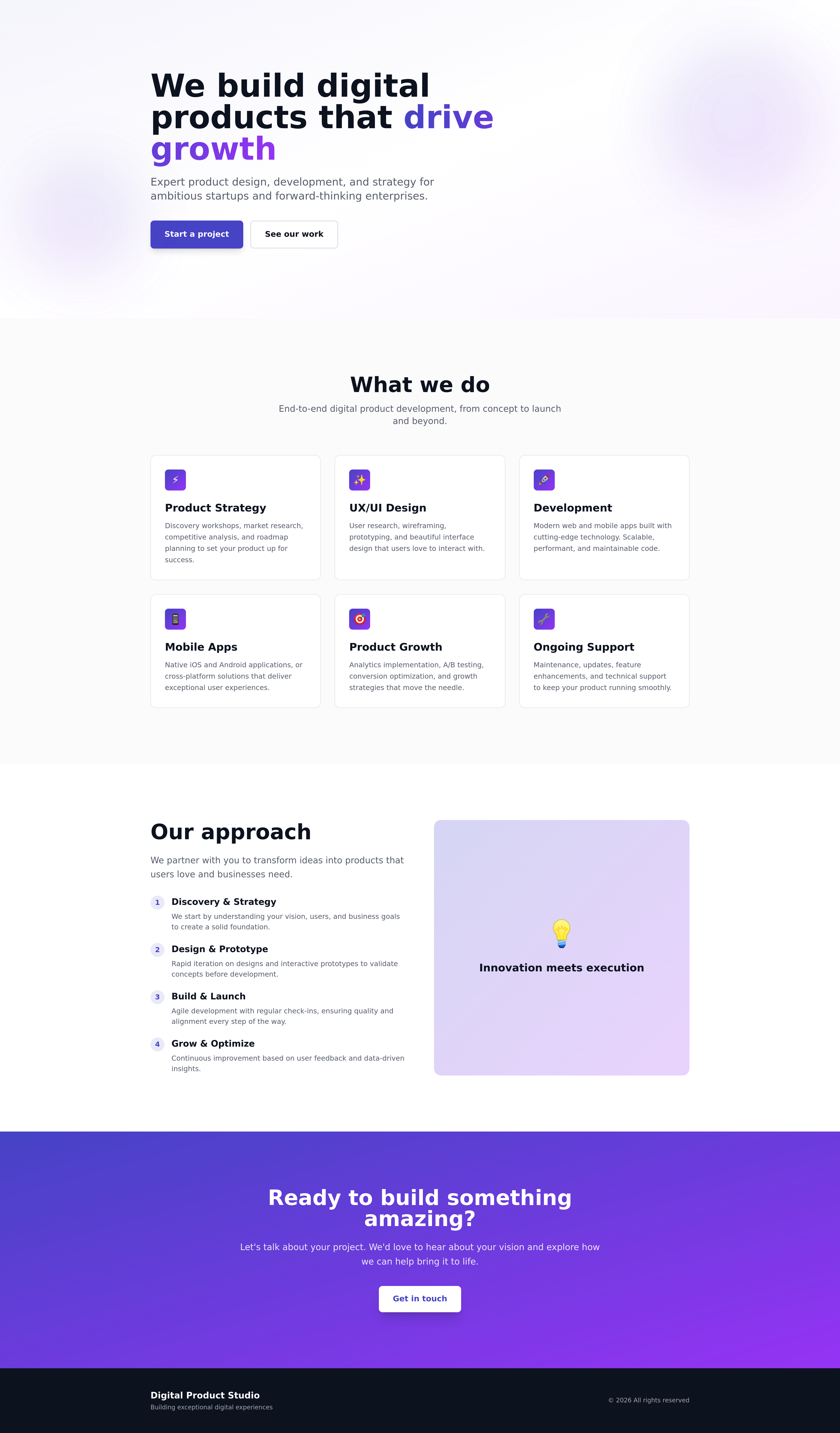 Showcase your digital product studio with a professional and modern business website. Highlight your services, portfolio, and client testimonials to attract new clients and talent. This marketing site is designed for digital agencies, design studios, and tech companies.
