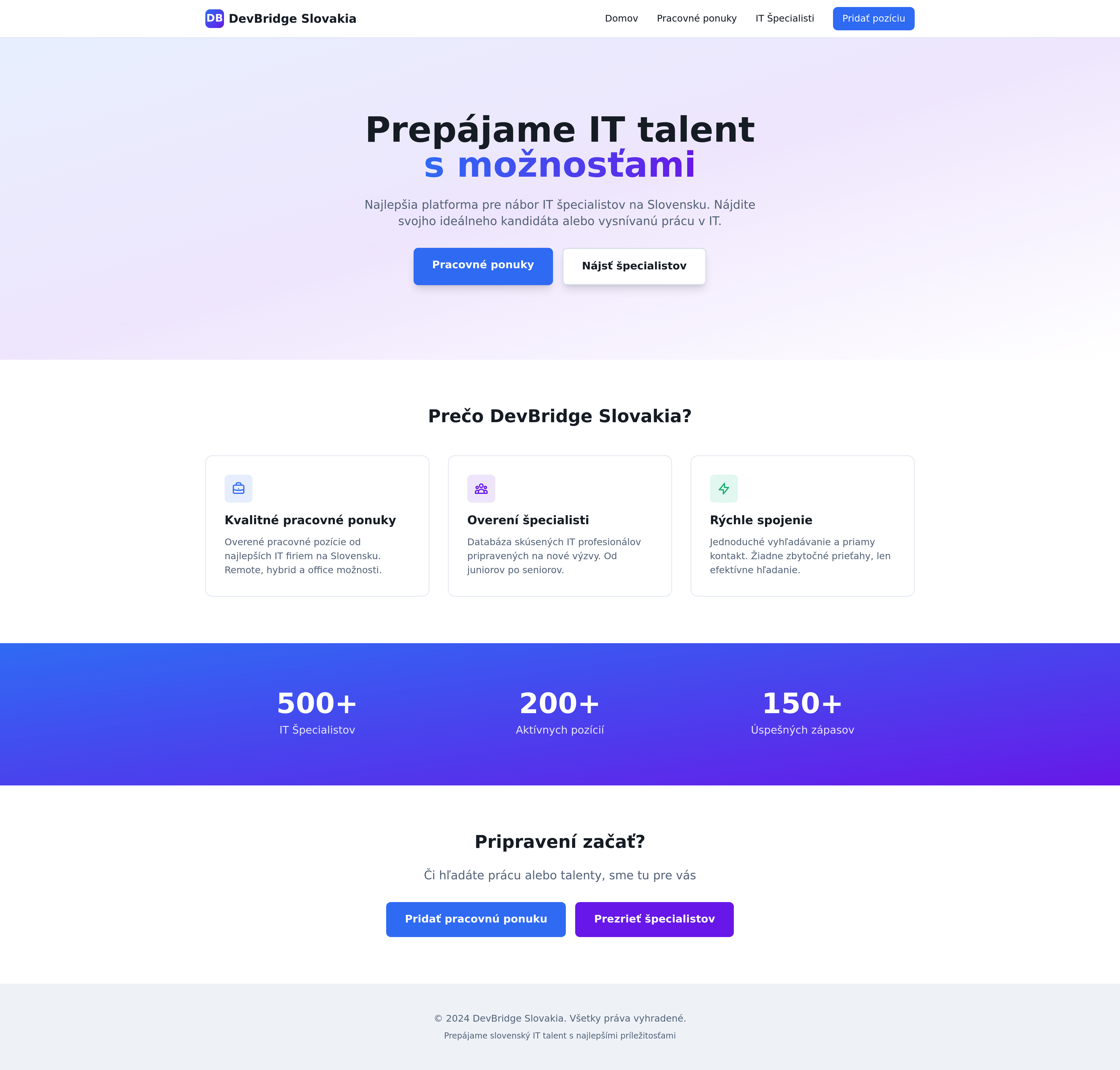 Recruit top IT specialists from Slovakia with this dedicated recruiting platform. Featuring a dynamic landing page, comprehensive job listings, and a directory of available Slovakian IT talent, this website is designed to connect companies with the best tech professionals. Optimize your hiring process and expand your IT team efficiently.