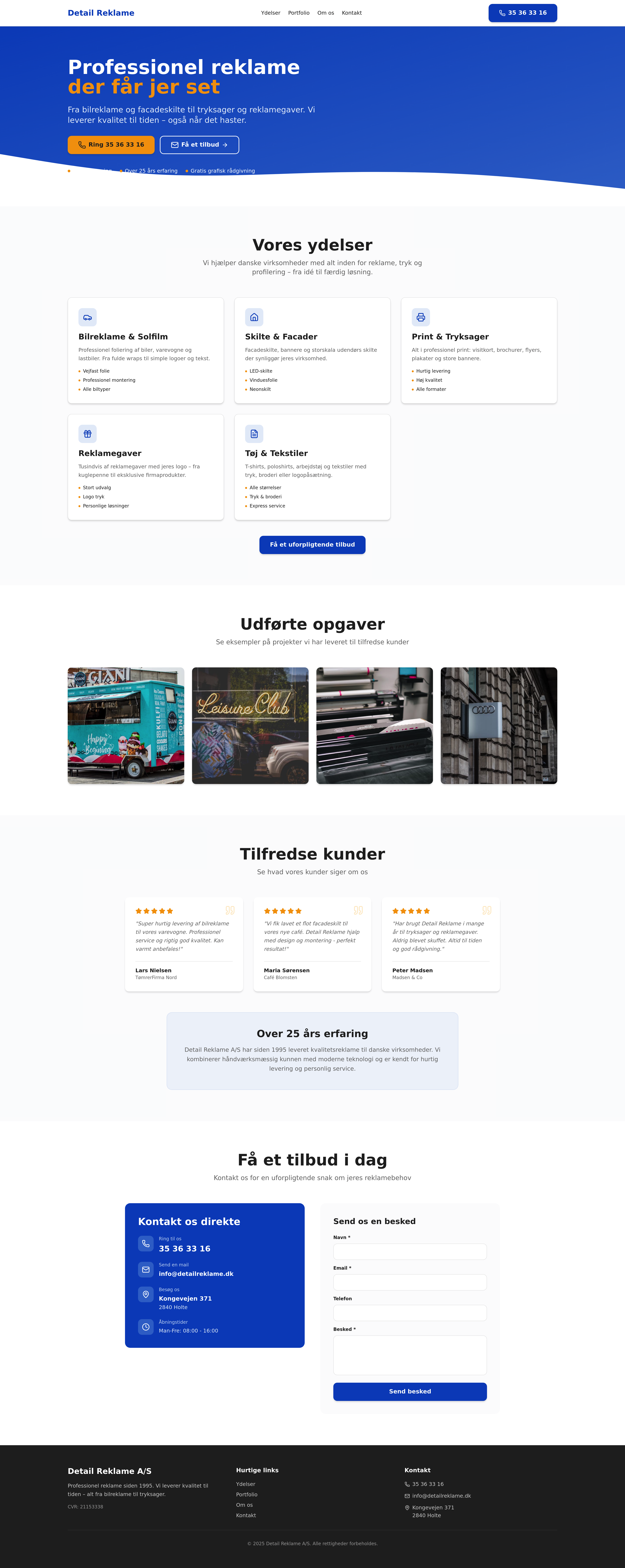 Modern and mobile-first business website redesign for a Danish advertising and signage company. Features prominent contact information, simplified navigation, customer testimonials, and a clean design with a calm color palette. Optimized for SEO and fast loading, showcasing services like car advertising, solar film, signs, banners, and print solutions to drive more inquiries.