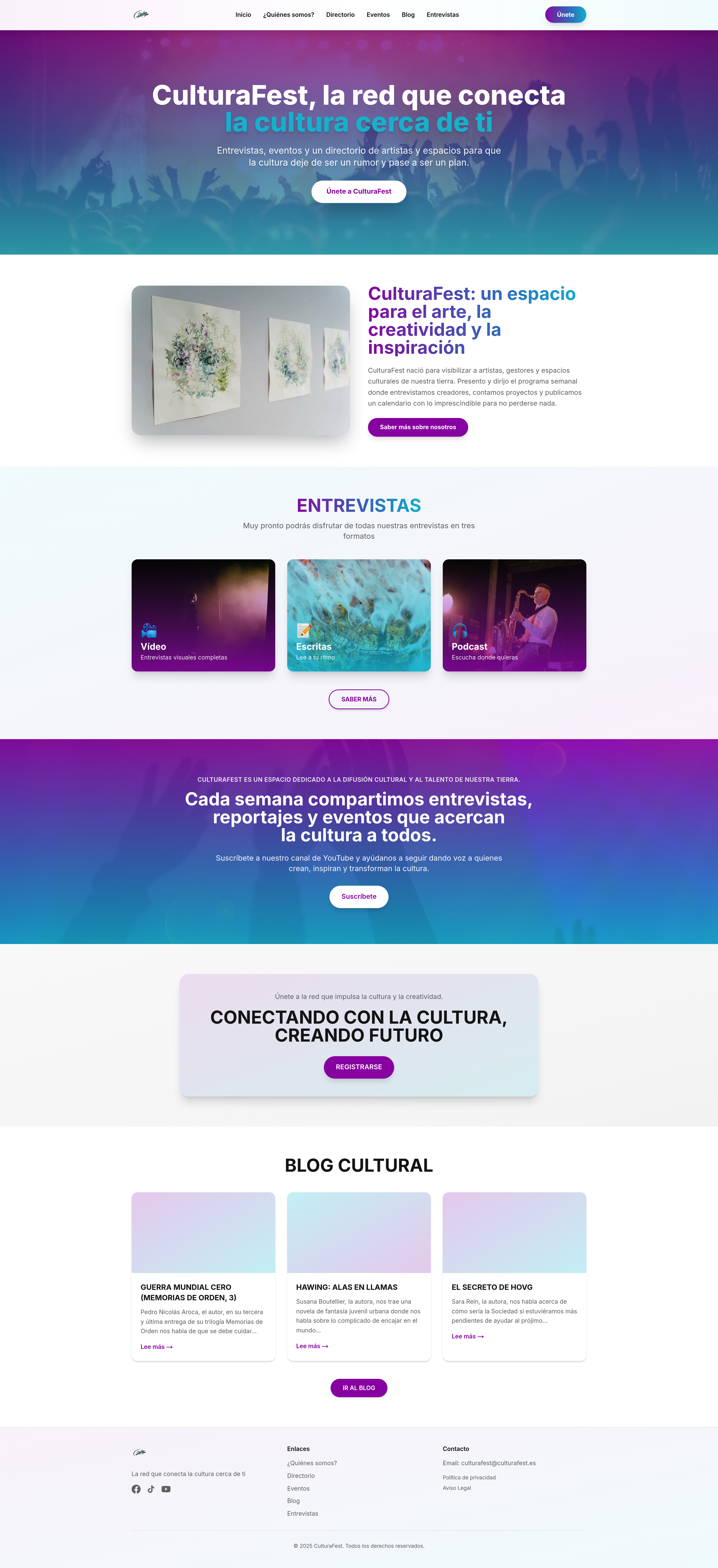 Rediseño web para CulturaFest, un festival cultural que celebra la música, el arte y la gastronomía. El nuevo sitio web busca mejorar la experiencia del usuario, facilitar la compra de entradas y ofrecer información detallada sobre artistas, horarios y actividades. Incluye galerías de fotos, videos y un blog con noticias del festival. Ideal para promotores de eventos, artistas y amantes de la cultura.