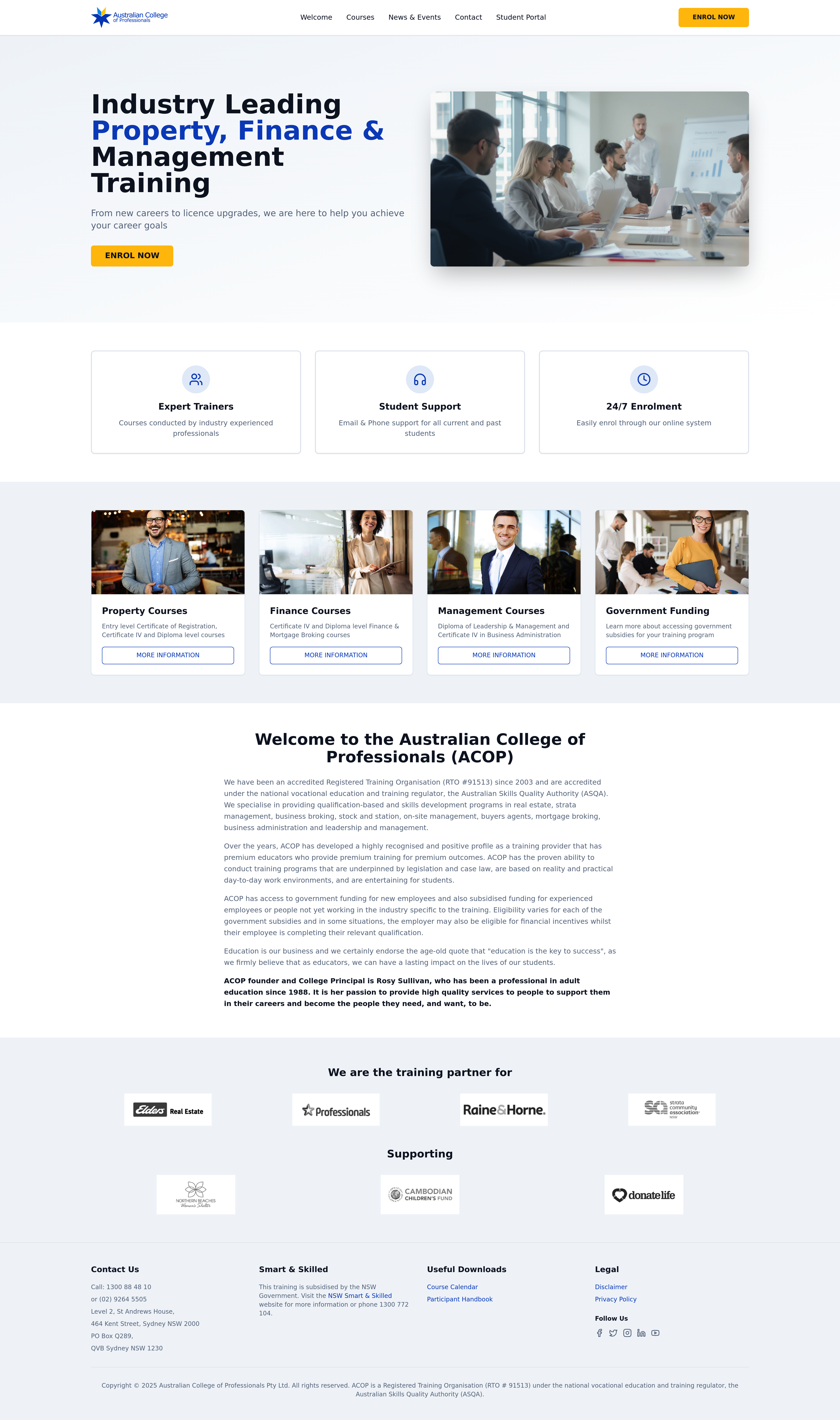 Explore a modern, professional redesign for the Australian College of Professional Studies (ACOPS) website. This project focuses on an enhanced user experience, contemporary layout, and improved visual appeal, reflecting ACOPS's identity as a leading educational institution. Discover a seamless navigation and engaging content presentation for courses, admissions, and college information.