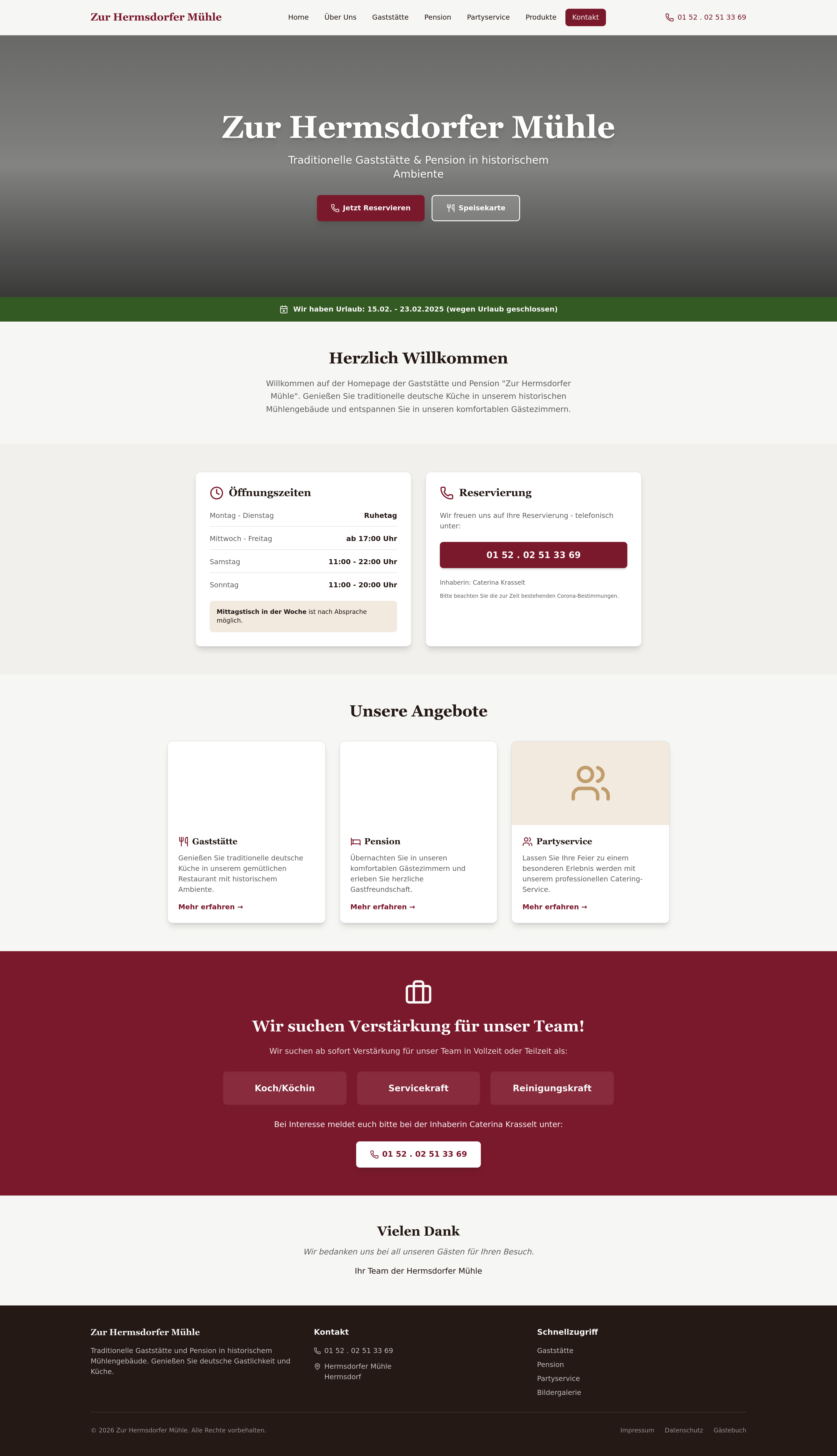 Explore Zur Hermsdorfer Mühle, a modern and professional redesign of a traditional German guesthouse and restaurant website. This project showcases contemporary web design principles, an improved layout, and enhanced user experience, reflecting the authentic charm of a local establishment. Discover delicious cuisine, comfortable accommodations, and event spaces through an intuitive and visually appealing interface.