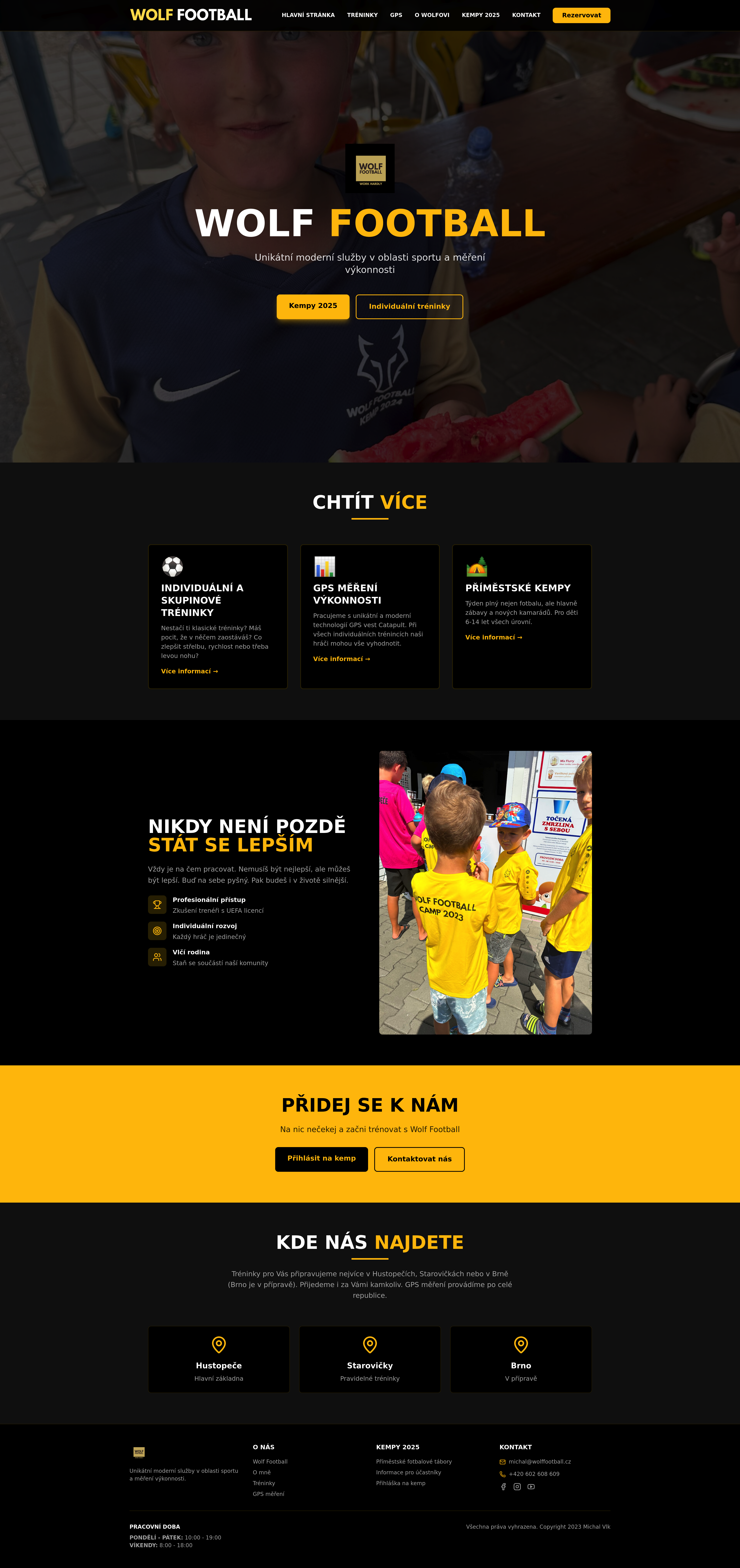 Create a dynamic landing page for WOLF FOOTBALL CAMP 2026. This high-performance landing page will attract young athletes and parents with a sleek black and yellow design, inspired by the successful www.wolffootball.cz. Featuring key camp information, registration details, and compelling visuals, it’s optimized for conversions and showcases the ultimate football camp experience.